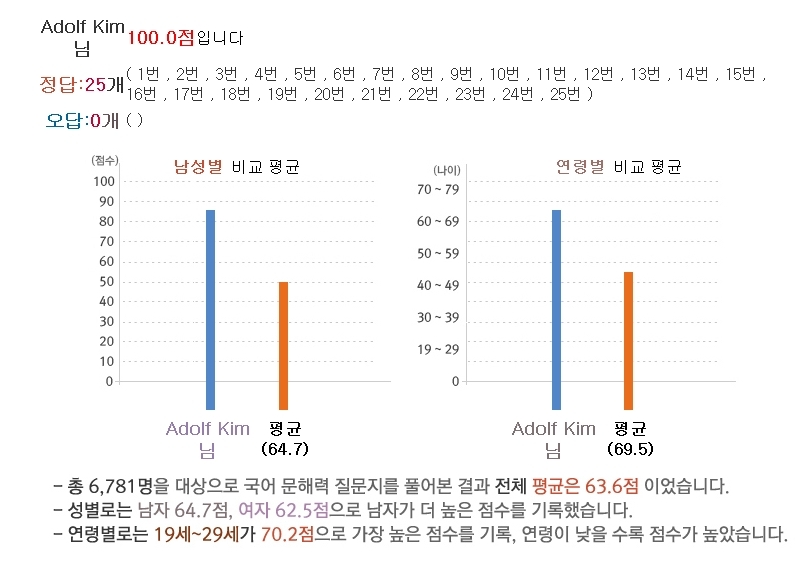 2008년 기준 데이터이기는 합니다만, 세대별로 가장 머리가 쌩쌩하다는(미성년자 빼고. 포함했다면 점수는 더 올라갔으리라 봅니다.) 20대도 70점을 조금 넘는 전국 평균이 나왔다고 합니다.