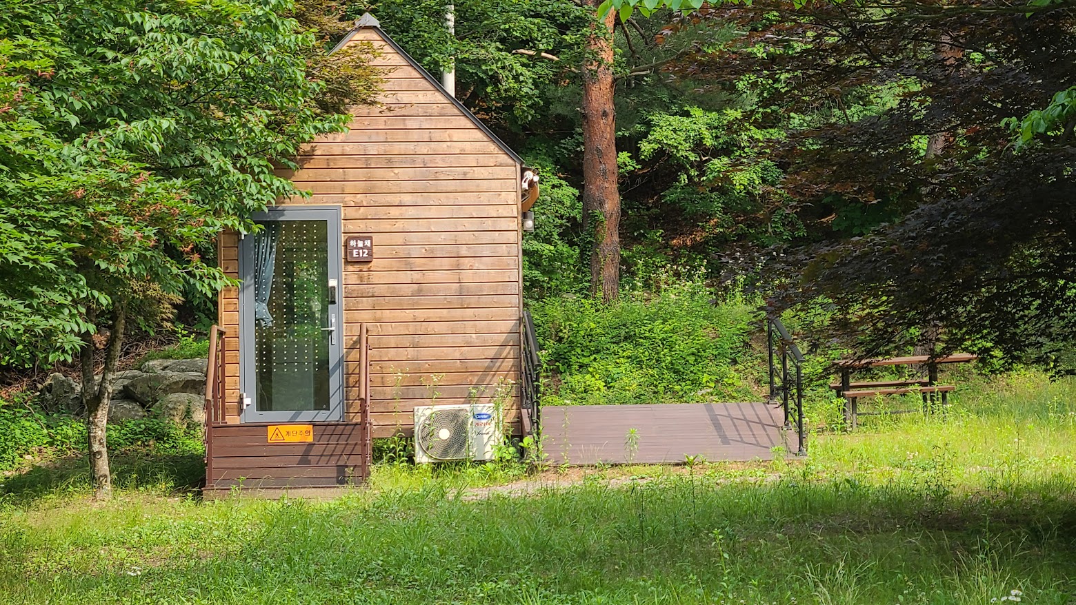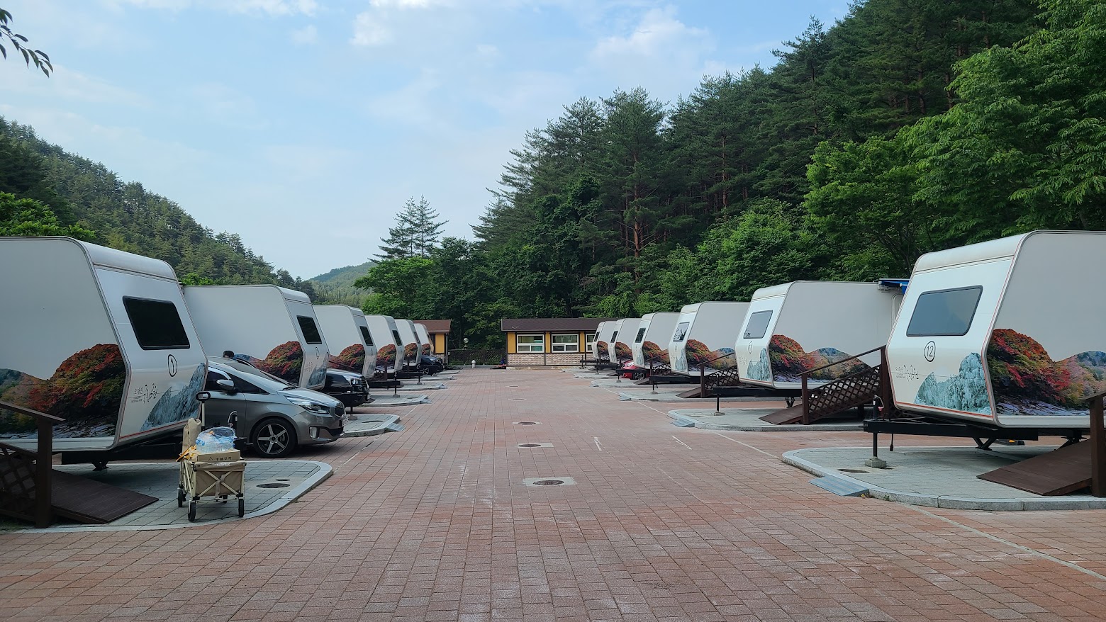 코로나 시대가 오면서 다들 캠핑에 글램핑~ 글램핑~ 노래를 부르는 세상이 와버려서 구석의 잘 안 쓰는 사이트들을 정리하고 이 자리에 고정형 카라반과 자연의집(소형 펜션)을 놓았습니다. 카라반은 4인용 대형으로 2인용 침대(매트리스까지 있습니다!!)와 1인용 벙커침대(이건 그냥 나무바닥.T_T) 2개가 있습니다. 좁기야 하지만 식기류 다 있고(침구류 제외) TV에 에어컨까지 다 있으며 독립 화장실/세면대까지 다 있는 그야말로 풀 옵션입니다. 자연의집은 식기류 등은 없지만 에어컨은 있고 좀 더 넓다는 장점이 있습니다. 대신 좀 비싸고 예약 잡기가 좀 어려운게 문제라면 문제죠.