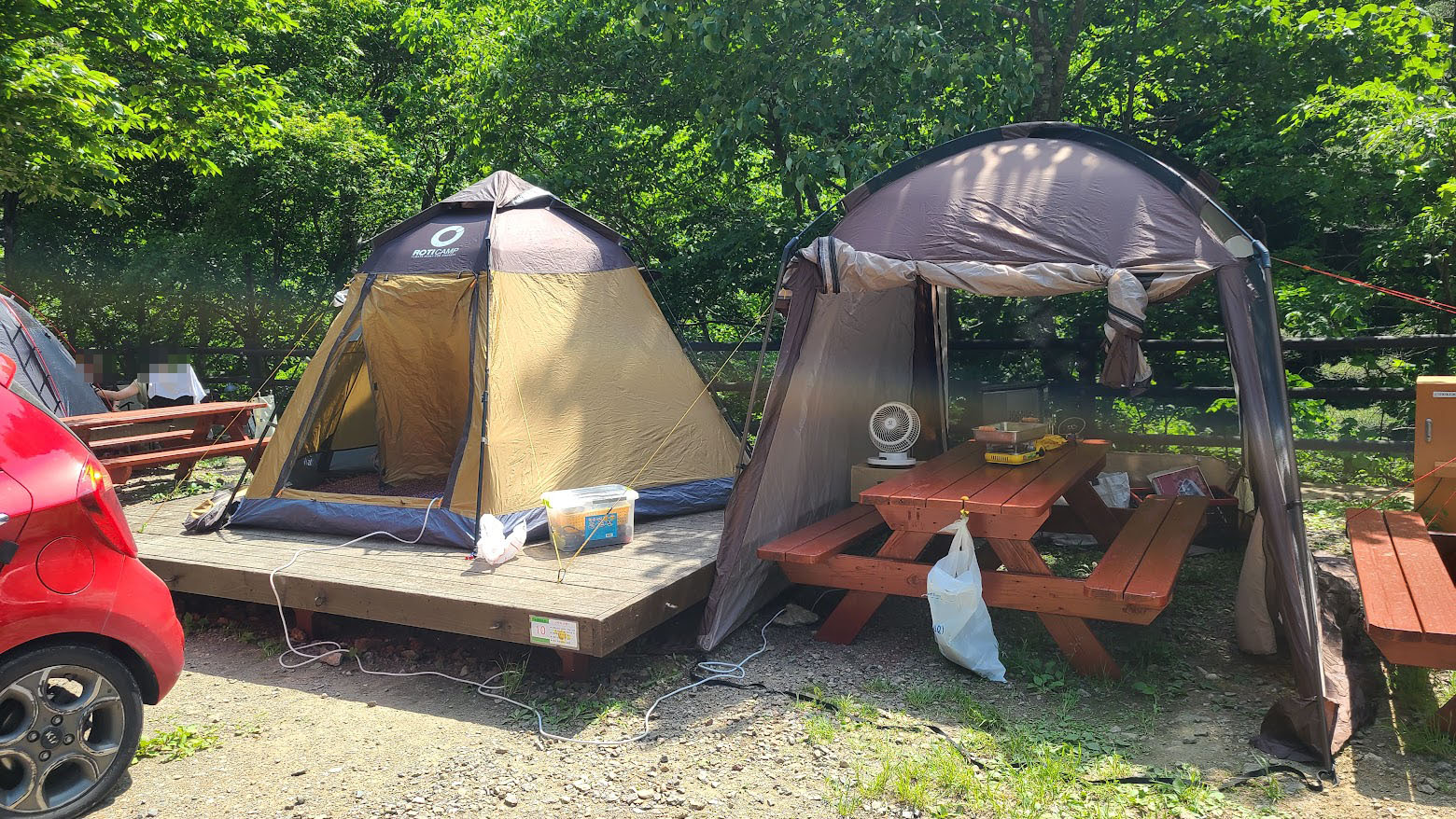 영지는 전형적인 자연휴양림 특유의 방식, 나무 데크입니다. 은근히 데크 사이즈가 큰 편이라 거실형 텐트도 5m대 중반급까지는 어려움 없이 칠 수 있습니다. 이번 캠핑(사실 5월 이야기입니다.)에서는 텐트의 수리 + 치기 편한걸 최우선하는 이유로 일반 오토텐트 + 셸터 조합으로 가서 좀 심플합니다. 나무 데크의 장점은 굳이 말할 필요가 없지만, '평평함의 확보', '땅의 습기 및 냉기의 차단'입니다. 매트만 적당하면 수면의 질 보장이 어느 정도 가능하죠.