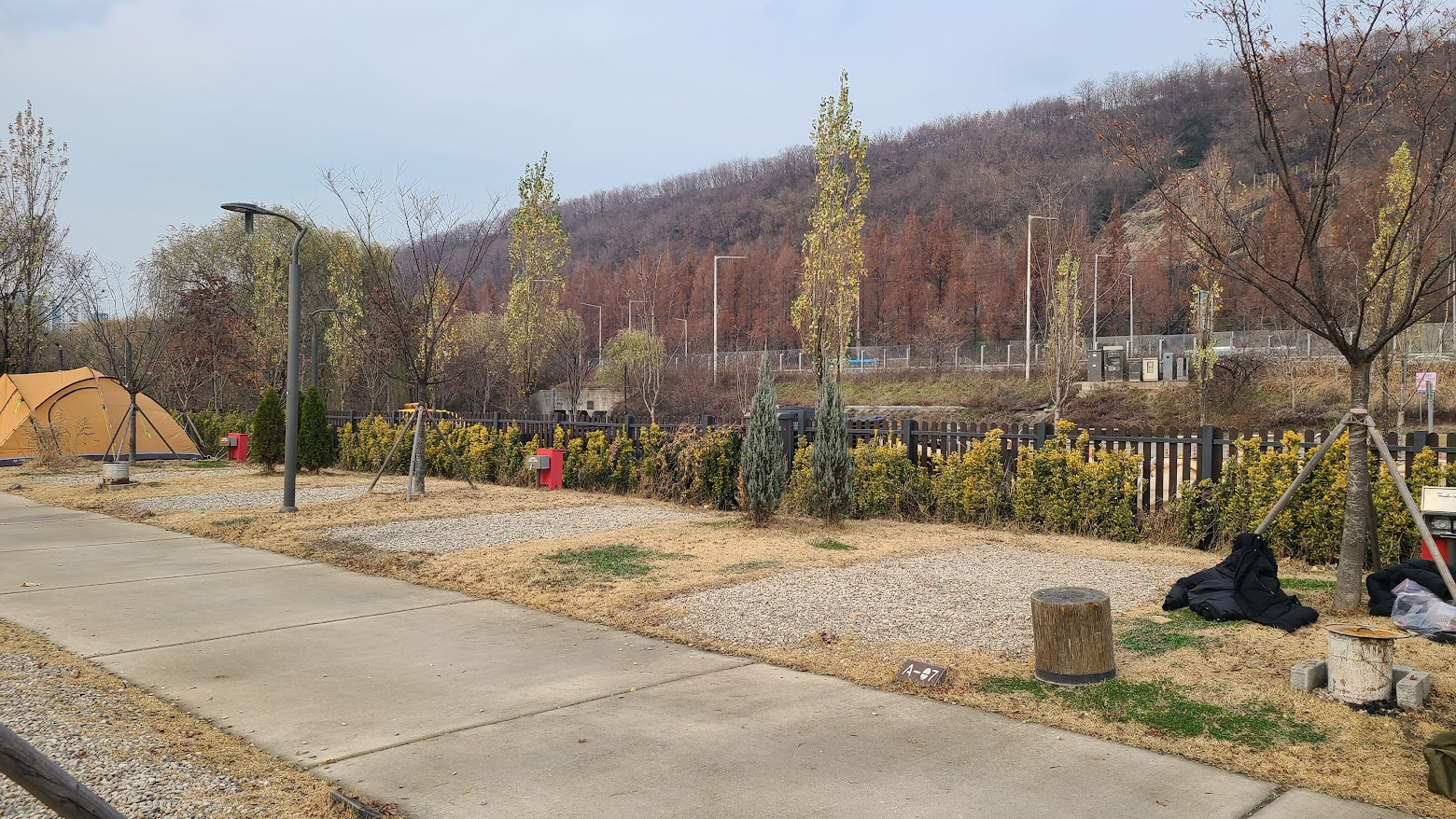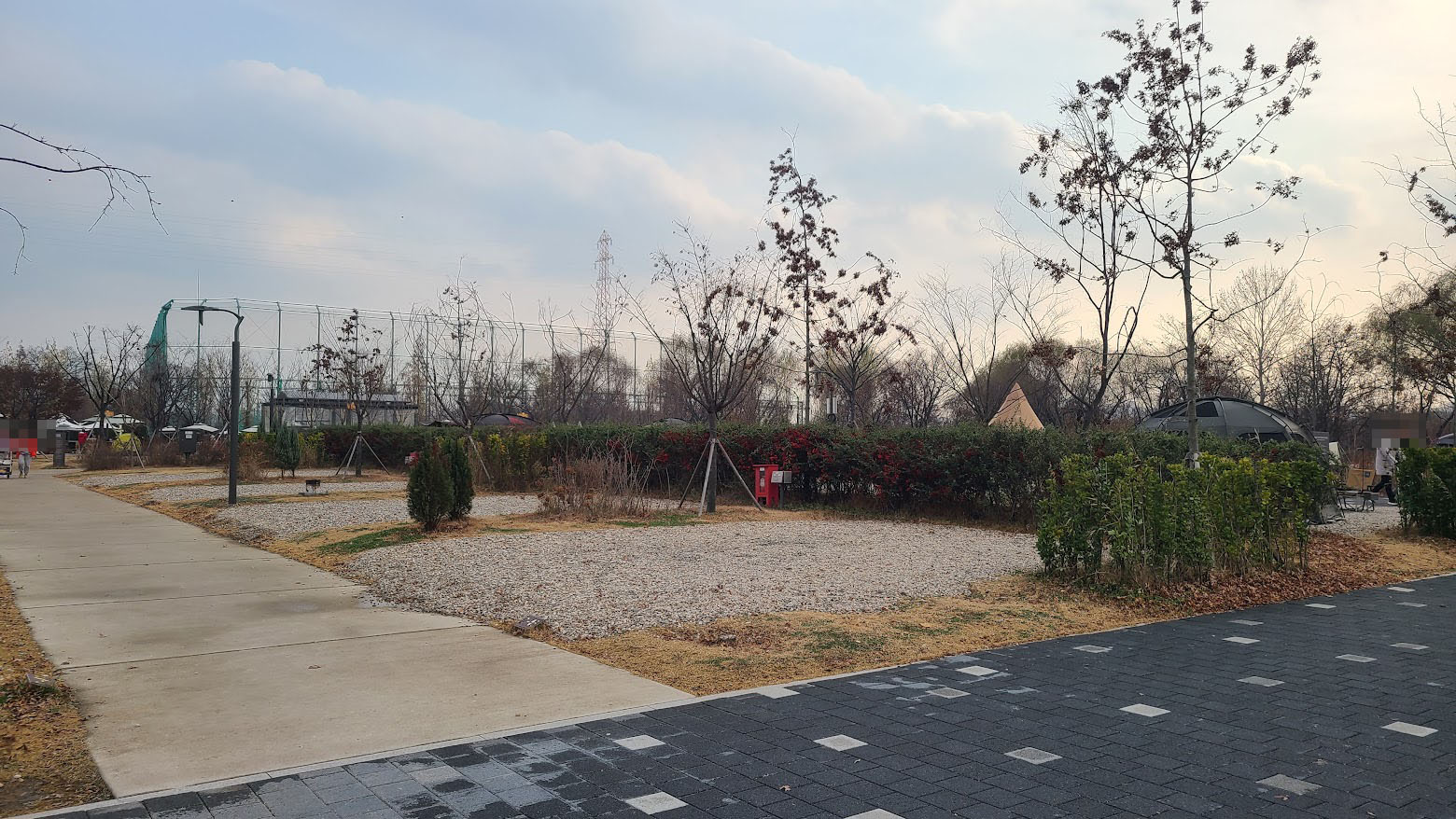 한강공원에 크게 만들어둔 곳이라 전체적으로 매우 평평하며, 영지 정리도 잘 되어 있습니다. 나무는 그냥 공원 수준으로 배치를 하여 숲에서 캠핑을 즐긴다는 느낌은 거의 받기 어려운 것이 아쉽지만, 대신 이렇게 정리가 잘 되어 있는 만큼 텐트 설치 등이 매우 쉽습니다. 이동로도 블럭 또는 아스팔트로 포장이 그런대로 잘 되어 있습니다. 대신 블럭이 좀 울퉁불퉁해서 카트를 끌 때 좀 주의는 필요합니다만.