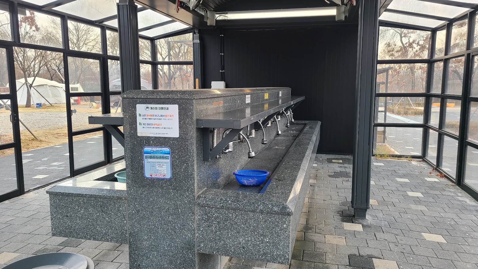서울 한 복판에, 돈 있는 서울시가 운영하는 캠핑장이기에 부대시설도 꽤 좋습니다. 화장실은 한강공원 수준으로 관리를 하고 있고(실제로 난지캠핑장도 한강공원의 일부로 봅니다.), 캠핑장에 딱 하나 있는 매점은 규모가 은근히 있어 웬만한 식료품과 캠핑 용품을 취급합니다. 가격이야 조금 비싸지만, 그냥 편의점 수준으로 생각하면 비싼 것도 아닙니다. 이 매점은 프리캠핑존이나 A/B 존에서 접근성이 상대적으로 좋은 편입니다. 겨울에 그런대로 온수도 나오니 손이 땡땡 얼지도 않구요.