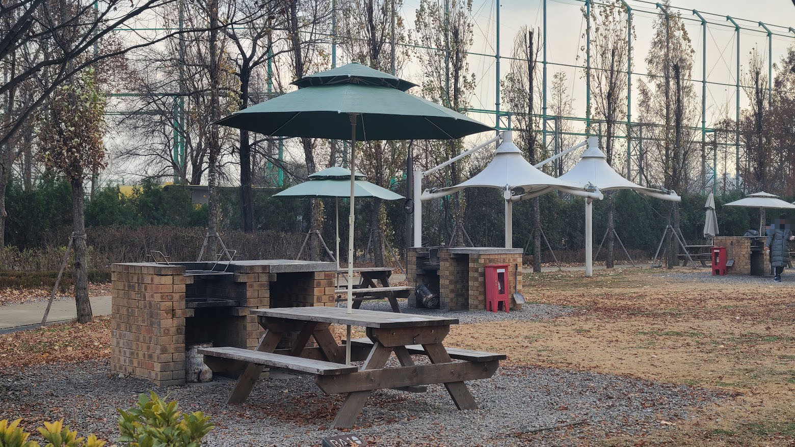 난지캠핑장은 다른 캠핑장과 다르게 그냥 '고기만 구워 먹자'는 사람들을 위한 바비큐존이 별도로 있습니다. 그냥 나무 테이블과 화로만 있는데, 숯과 고기, 필요한 경우 석쇠만 가져가면 '야외에서 고기 먹자'를 만끽할 수 있습니다. 사실 여기도 경쟁은 치열하지만, 비용이 캠핑 사이트보다는 훨씬 저렴한데다 시설이 그런대로 갖춰져 있어 그냥 고기만 쳐묵(?)을 원하시는 분이라면 굳이 이것저것 장비를 싸 올 필요가 없는 장점이 있습니다. 불멍만 할 수 있는 캠프파이어존도 있지만 이건 사진은 유감스럽게도 없습니다.