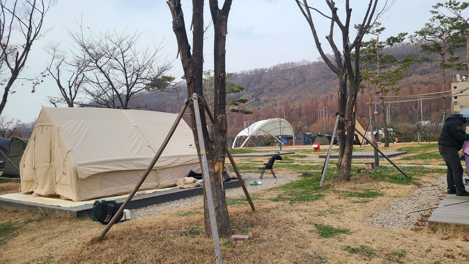 아예 영지를 딱 정해 놓은 캠핑존 이외에도 유럽이나 일본식 자유 캠핑존도 있습니다. 공공 캠핑장에서는 좀 드문 잔디 캠핑장인데, 여기는 전기는 안 들어오기에 전기 장치가 정말 눈에 선한 여름 캠핑에는 좀 불리하지만, 석유 난로만 있으면 대충 어떻게든 해결이 되는 겨울 캠핑에는 은근히 인기가 있습니다. 석유 난로는 허용하기에 이 부분은 그리 걱정할 필요는 없습니다.
