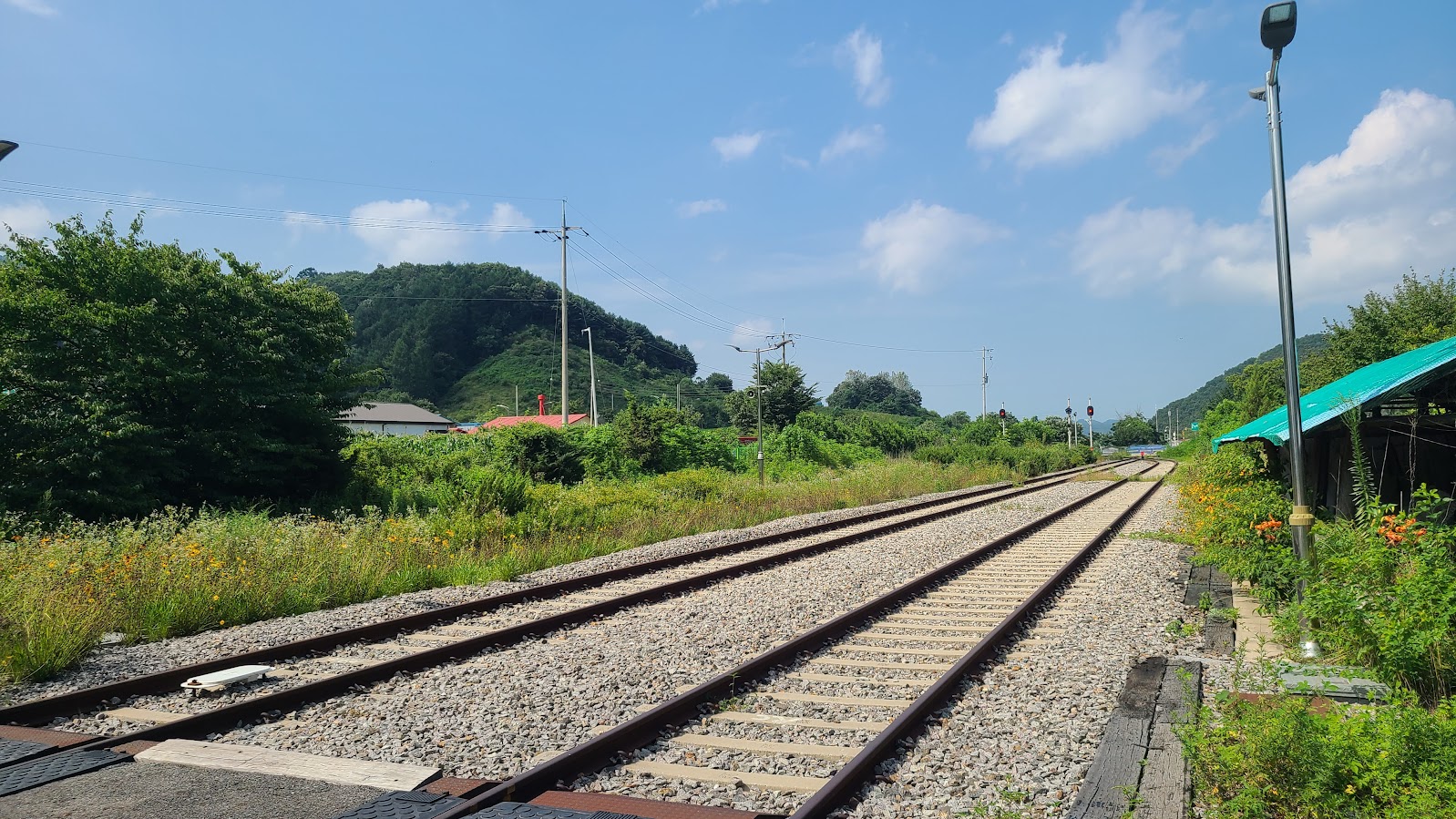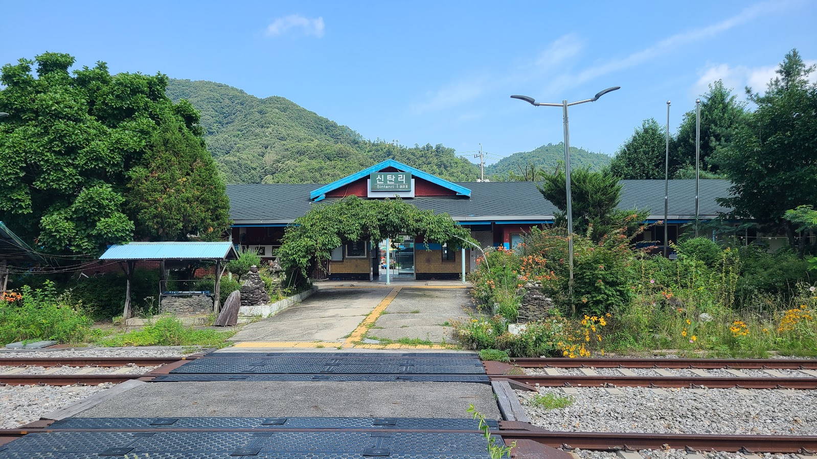 그렇지 않아도 신탄리역은 조용한 시골역이지만, 운영도 하지 않고 있어 이제는 주변에 인기척도 없습니다. 대합실은 청소는 하고 있으나 창구는 닫히고 정적만 감돕니다. 또한 플랫폼은 패이고 갈라져 운영되지 않는 역의 스산함을 보여주지만, 그래도 가을에 운행 재개를 위해 선로 보수 등은 하고 있는 것으로 보입니다. 마침 갔던 토요일 오전은 중부지방의 장마도 잠시 물러나 날도 좋아서(뒤집어 말하면 미칠듯이 찌고 덥습니다.) 구름은 좀 있지만 파란 하늘이 좋은 배경이 되어 주었습니다. 폐역도 아님에도 운영하지 않는 아무도 없는 역을 바라보는 기분은 은근히 묘합니다.