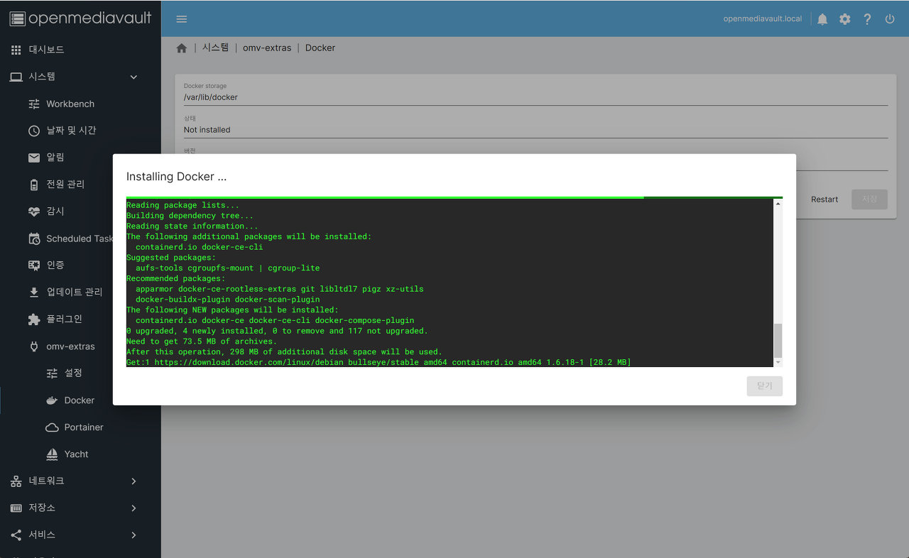 OMV의 단점이라면 단점이 버전 5부터 확장기능(플러그인)을 대부분 Docker 컨테이너 형태로 바꿔 버린 것입니다. 즉 Docker 설정을 못 하면 기본 기능 이외의 추가 기능 확장이 매우 어려워집니다. 문제는 Docker도 기본으로 포함이 안 되어 있어서 따로 설치를 해줘야 한다는 것입니다. 그래서 일단 Docker 설치 관련 내용을 콘솔을 연결한 김에 수행하시라 적습니다.