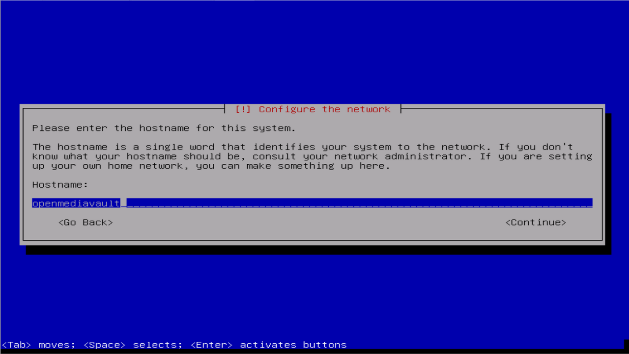 어찌 보면 나름 중요한 화면인데, 바로 'NAS의 이름'을 정하는 것입니다. 즉 네트워크에서 보이는 컴퓨터의 명칭입니다. 기본값은 위에 적힌 바와 같이 openmediavault지만 임의로 바꿀 수 있습니다. 다만 아시다시피 웬만하면 호환성 문제로 영문 입력을 권장합니다. 그래서 앞에서 그냥 언어 설정을 영어로 하라고 한 것입니다. 이 부분은 나중에 어렵지 않게 바꿀 수는 있기는 합니다만 처음 할 때 잘 하는 마음 가짐이 중요합니다.^^