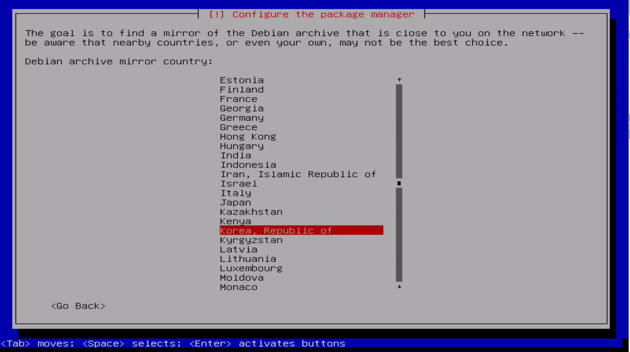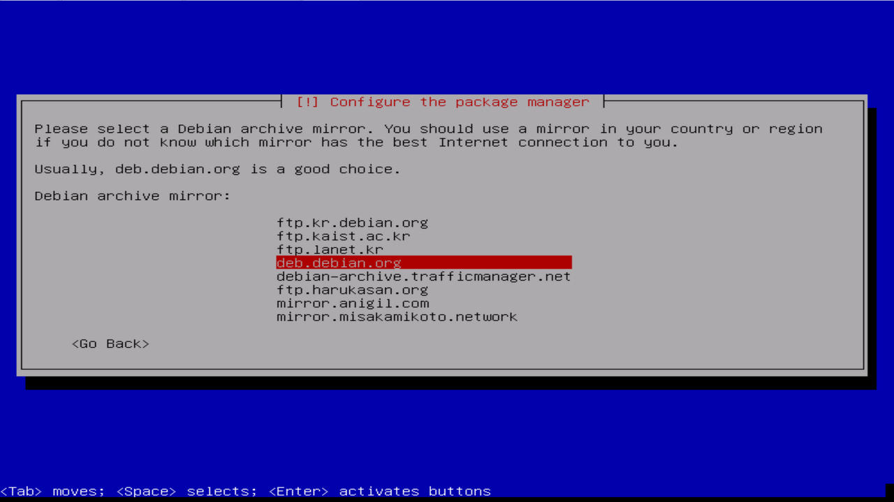 패키지 매니저는 데비안 리눅스의 인터넷을 통한 기능 추가나 업데이트를 관할합니다. 리눅스를 써본 분들은 말을 할 필요도 없는 부분이지만, 각 지역에 이를 저장하는 서버가 있으며 이들 가운데 하나를 지정하면 됩니다. 보통 우리나라 내부 서버를 지정하면 되는데, 미국이나 다른 국가를 지정하셔도 되나 아무래도 속도는 좀 느립니다. 다시 우리나라 안에서도 몇 군데의 미러 서버가 있는데, 그냥 유명한 데를 지정하시면 되겠습니다. 가장 아래에 있는 모 번개 여고생(?) 서버를 지정하셔도 됩니다.^^