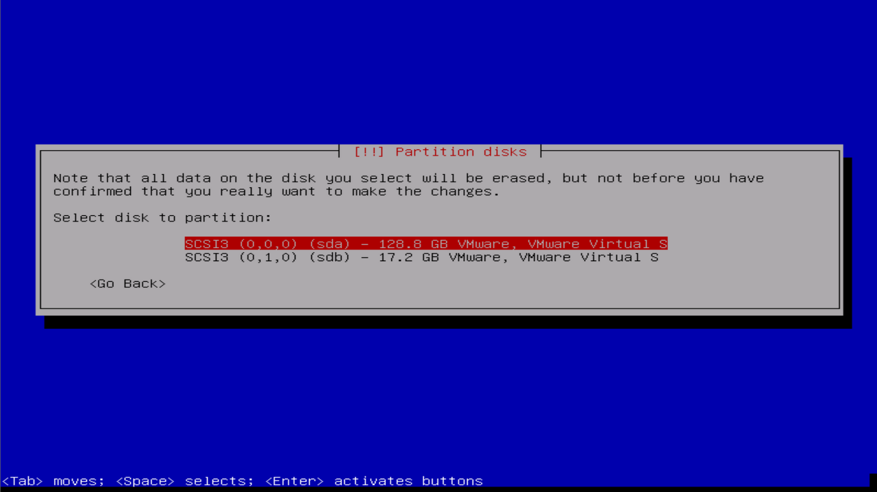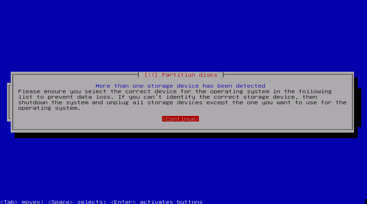 이제 어디에 OMV를 설치할지 묻는데, 저장장치가 두 개 이상 있을 경우 이렇게 두 개 이상의 저장장치가 있으며, 설치를 하면 그 저장장치의 데이터가 싹 날아간다는 경고가 뜹니다. 그 다음 설치 저장장치를 묻는데, 저장장치의 이름이 옆에 나오기는 하지만 똑같은 저장장치가 복수로 있는 경우 엉뚱한 곳에 설치하지 않도록 주의는 필요합니다. 설치할 파티션만 지정하면 이후 파티션 설정과 포맷은 알아서 자동으로 합니다.