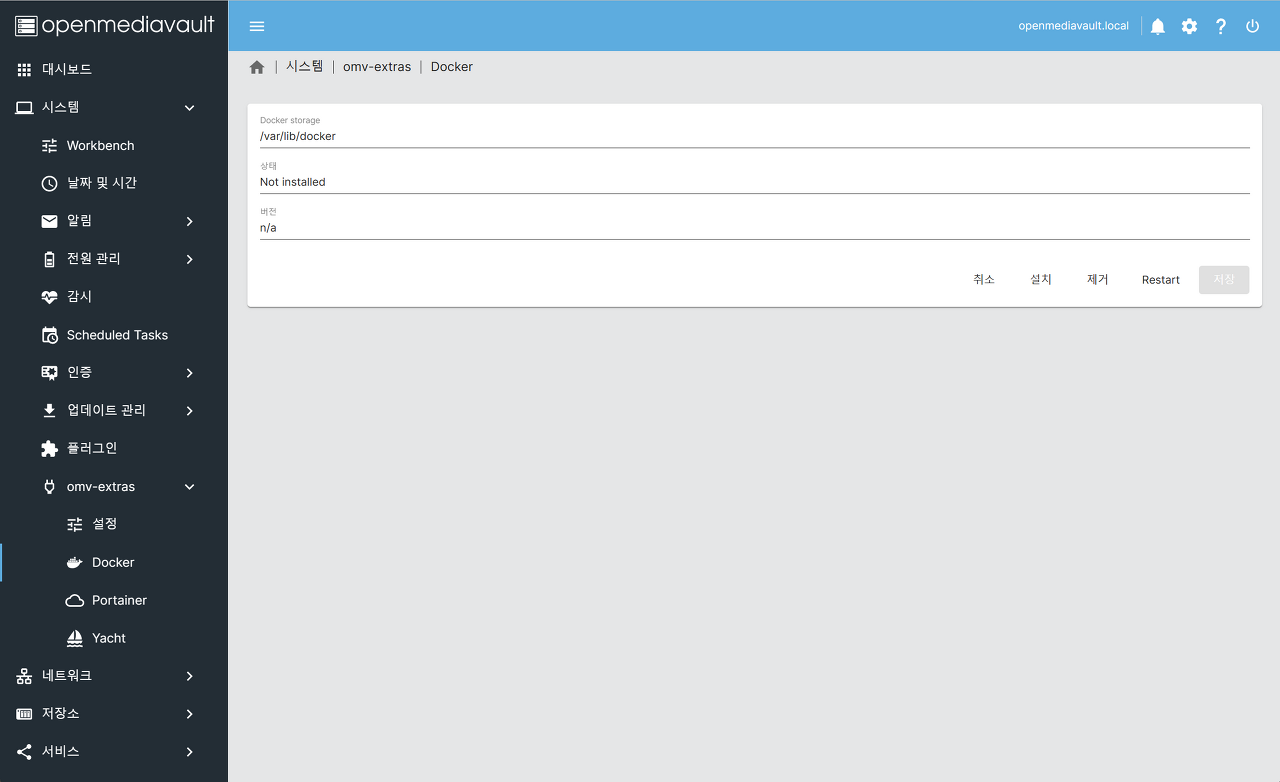 다음 포스트에서 설명할 화면이기는 하지만 이걸 완료하면 OMV 관리자 화면의 시스템 메뉴에 'omv-extras'라는 것이 추가됩니다. 여기에서 다시 Docker와 Portainer라는 것을 설치해야 하는데, Docker야 Docker니까 그렇다 치고 Portainer는 Docker용으로 나온 여러 컨테이너 기능을 관리하는 관리 툴입니다. 즉 Docker용 확장기능은 전부 이 Portainer를 통해 설치하고 관리한다 보시면 됩니다.