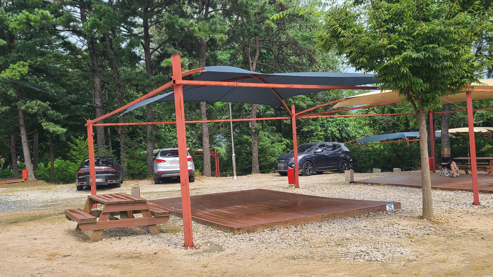 이게 그 텐트 미제공 영지입니다. 영지의 구성은 같지만 고정형 텐트가 없으며 대체로 좀 외진 곳에 있습니다. 포천캠핑장의 경우 지금 사진에 보시는 두 곳 아외에도 저기 은색 SUV가 있는 장소 아래에도 더 있습니다. 조용하게 캠핑을 하려면 저 곳도 좋지만, 짐을 옮기기가 조금 힘든게 단점입니다. 추가로 벌레가 더 많습니다.T_T
