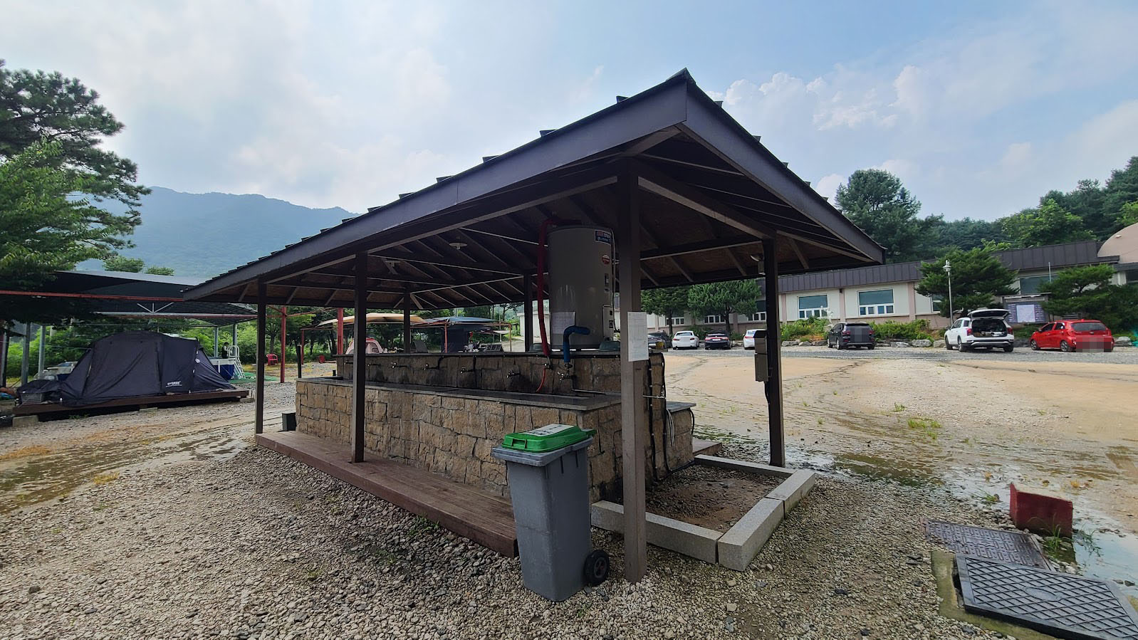 일단 위 사진에서도 볼 수 있듯이 영지 위에는 캐노피가 쳐 있는데, 이건 비막이 용도보다는 햇볕 차단용이라 비가 올 때 본격적으로 막아주긴 좀 부족합니다. 그리고 서울캠핑장에 따라서는 이것도 없거나 보수중인 경우도 있기에 이 경우는 그냥 재수가 없다 생각하시면 되겠습니다. 두 번째 사진에서 데크 옆에 뭔가 쳐져 있는 것은 제 개인용 셸터이며, 저 안에 나무 테이블이 있습니다. 하필 도착한 직후에 짧게 비가 오는 바람에 비를 맞으며 급히 저걸 쳐야 했고, 30분 지나니 햇볕이 쨍쨍 내리쬐며 찜구이가 되어야 했다는 슬픈 문제가 있습니다.T_T