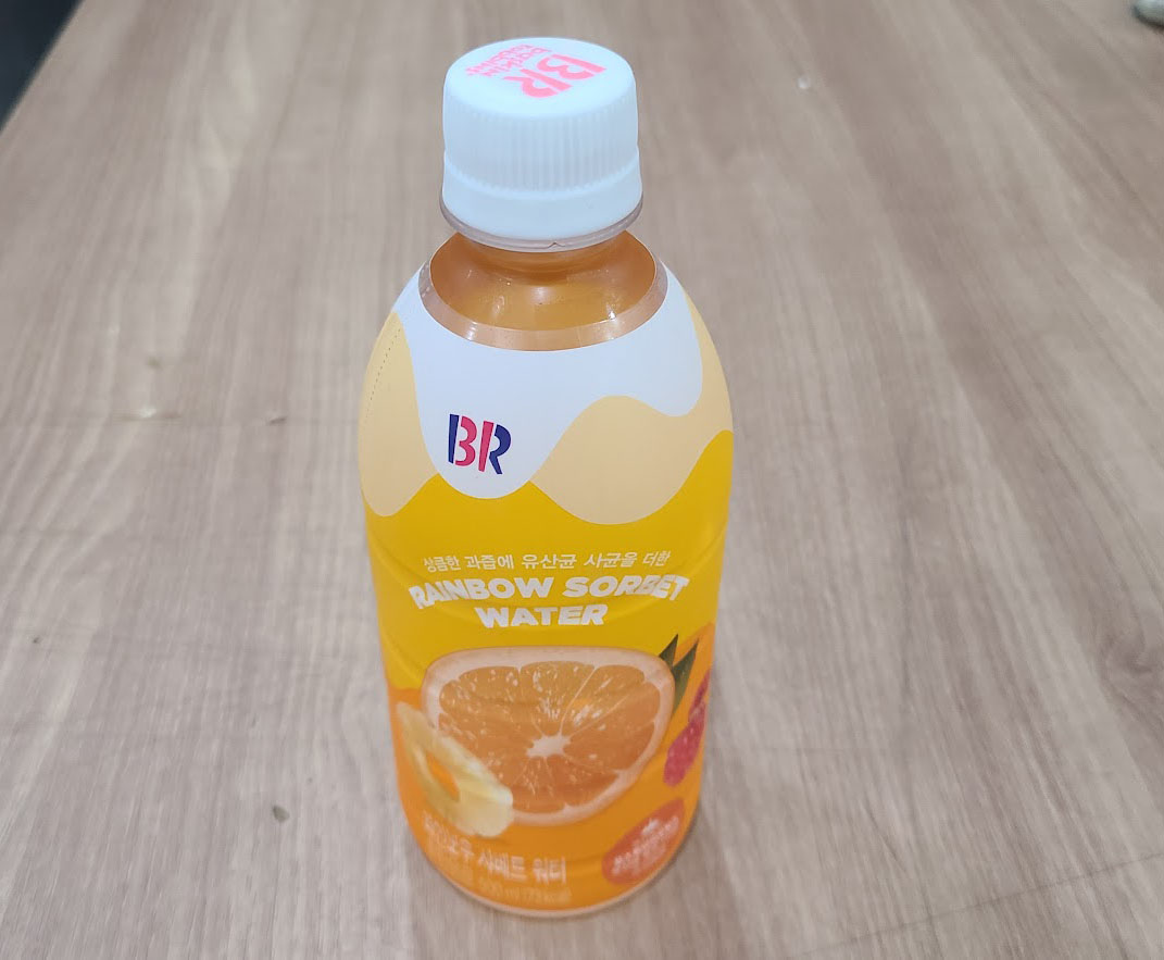 콘/파인트 아이스크림 체인의 제왕, BR도 이러한 콜라보에 동참하여 요즘 인기 아이스크림맛을 흉내낸(절대 같지 않습니다.) 탄산음료 등을 내놓고 있습니다. 그 가운데 오늘 원샷을 때린 것은 레인보우 샤베트맛 워터입니다.
