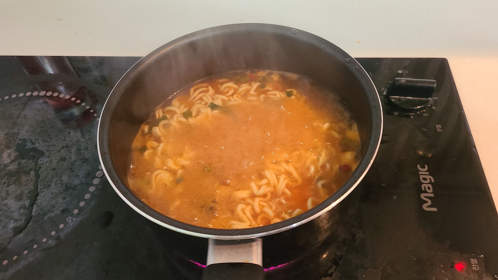 맛은... CU 청양고추라면의 강도를 기준으로 할 때 80% 내외 수준입니다. 물을 조금 적게 하면 100% 수준의 강도도 낼 수 있겠죠. 편의점에서 먹던 이 라면 맛과 거의 비슷한 맛이 나며 조금 약해졌다고는 하나 혀에 분명히 남는 매운 느낌이 있습니다. 속된 말로 맵찔이를 자부하는 분이라면 도전하기가 좀 껄끄러운 수준인 것은 사실입니다. 다만 너무 밸런스를 추구하여 후추맛이 완전히 동화되어 그냥 쇠고기면의 조금 매운 버전에 불과하게 된 흑후추소고기라면에 비해 분명한 특징을 갖고 있습니다.