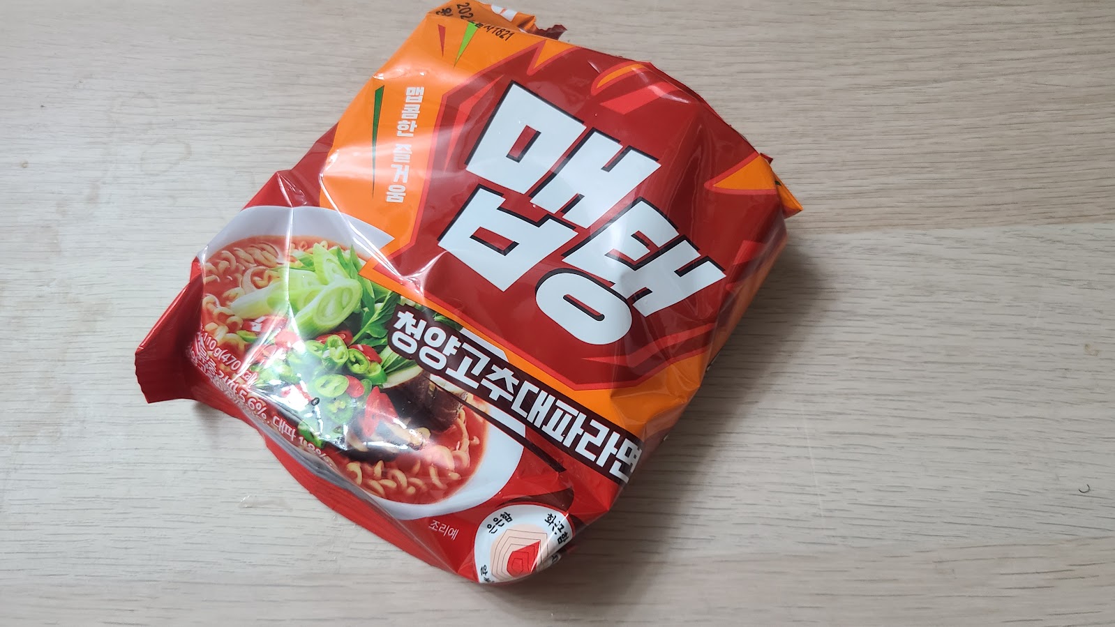 제목 그대로 이 라면의 맛은 '청양고추 대파'입니다. 다만 풋풋한 청양고추 색상의 패키지가 아닌 무슨 고추장라면의 패키지 색상이라 이건 좀 마음에 안 드는군요. 청양고추 라면을 가장 먼저 선보인 CU만 해도 녹색 패키지를 썼기에 이 점은 좀 아쉽습니다.