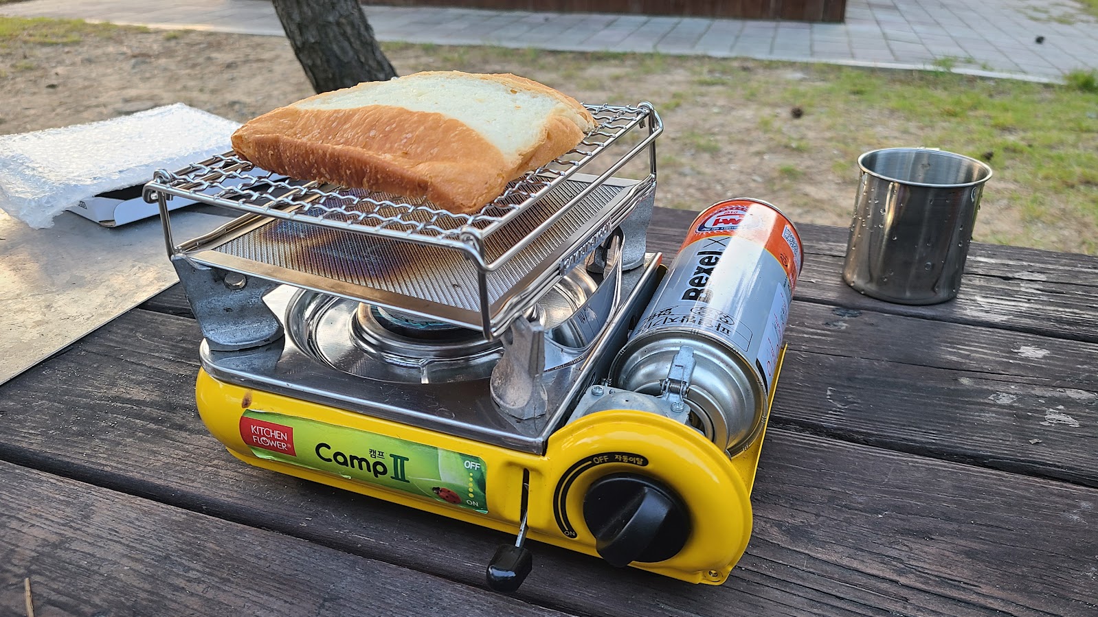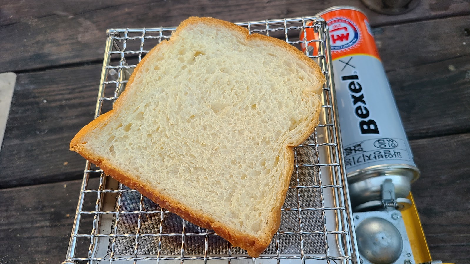 덤으로 이게 구워진 모습인데, 보통 토스터하면 생각나는 노릇노릇한 수준은 아닙니다. 이는 버너의 화력 때문인데, 강염버너를 쓰면 이게 가능하겠지만 일반 버너의 화력으로는 시간도 좀 걸리고 나름 바삭바삭하게 잘 구워지긴 해도 비주얼면에서 폼이 날 정도로 구워지지는 않습니다. 폼나는 것을 바란다면 강염버너의 준비가 필요합니다.