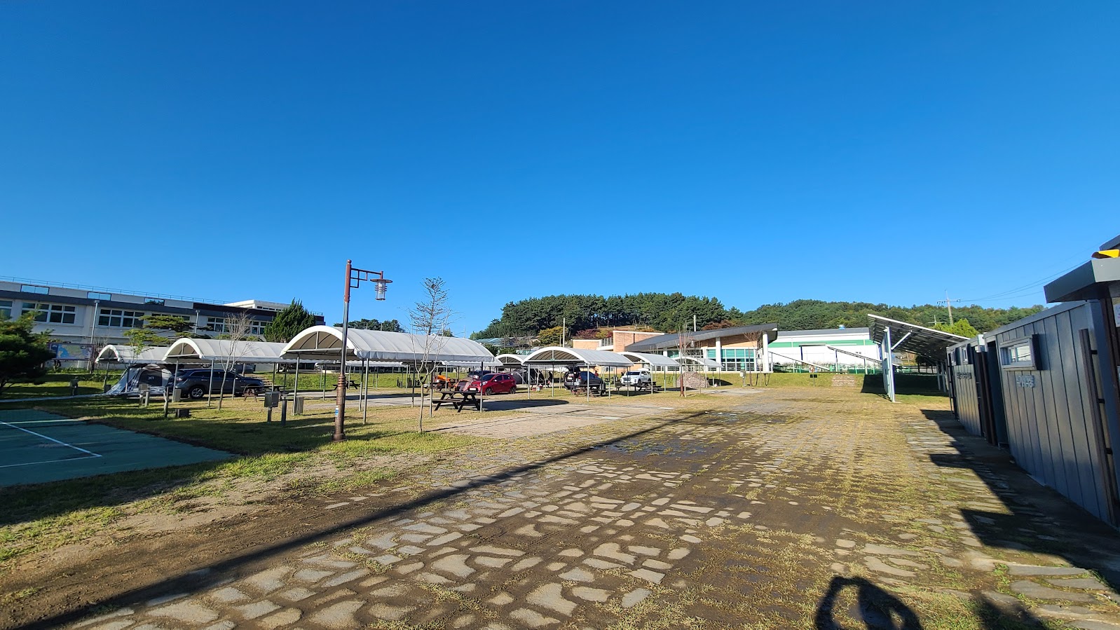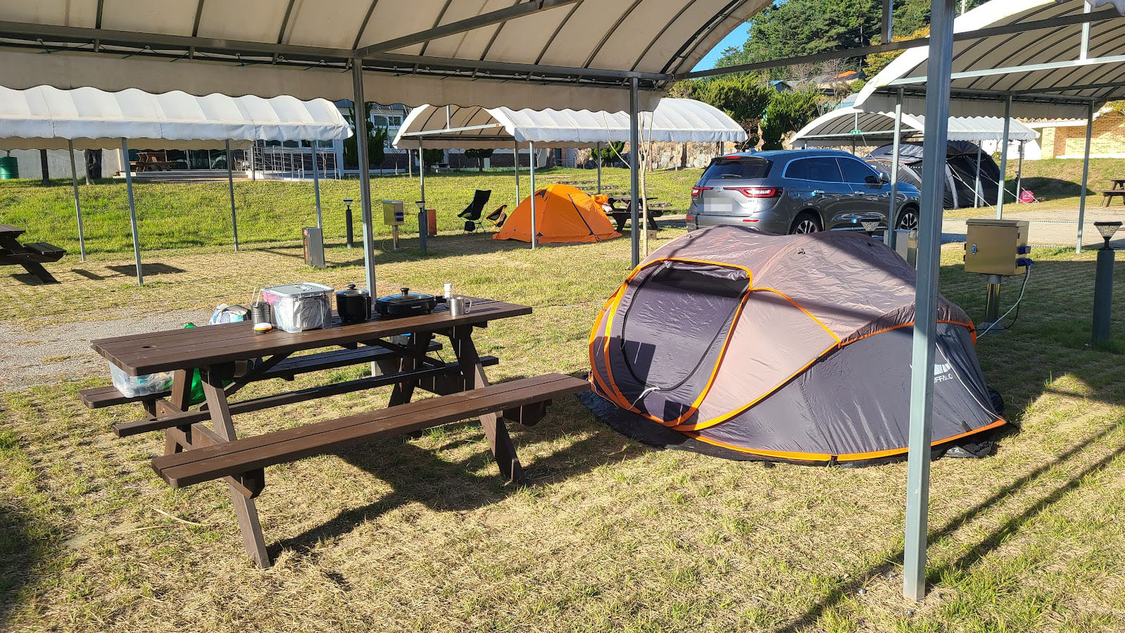영지는 캐노피가 덮인 실제 활동 영역과 그 옆의 주차 공간으로 나뉩니다. 카라반이나 캠핑카도 들어는 가지만 이들을 연결할 수 있는 전기 및 수도 관련 시설이 따로 있지는 않습니다. 그래도 아예 이들이 못 들어가던 기존 서울캠핑장보다는 낫다면 낫죠.
