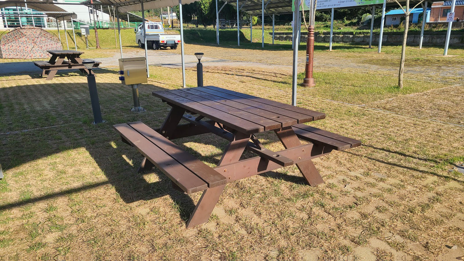 나름 올해 연 삐까뻔쩍한 곳이라 전기 콘센트도 4개를 제공해줍니다. 다만 이 영지 타입이 기존에 보던 캠핑장과는 좀 다른게 문제인데, 이 사진에서 보는 바와 같이 시멘트 블럭 영지입니다. 그 사이에 틈새로 잔디를 심은 맨땅 부분이 나오는데, 팩을 박으려면 이 맨땅 부분을 찾아야만 합니다. 나름 땅이 고른 점은 장점이지만 풀 때문에 시멘트 부분과 땅 부분의 구분이 쉽지 않아서 팩으로 쑤셔가며 팩 박을 자리를 찾아야만 합니다. 다른 서울캠핑장과 마찬가지로 나무 테이블은 기본으로 제공합니다.