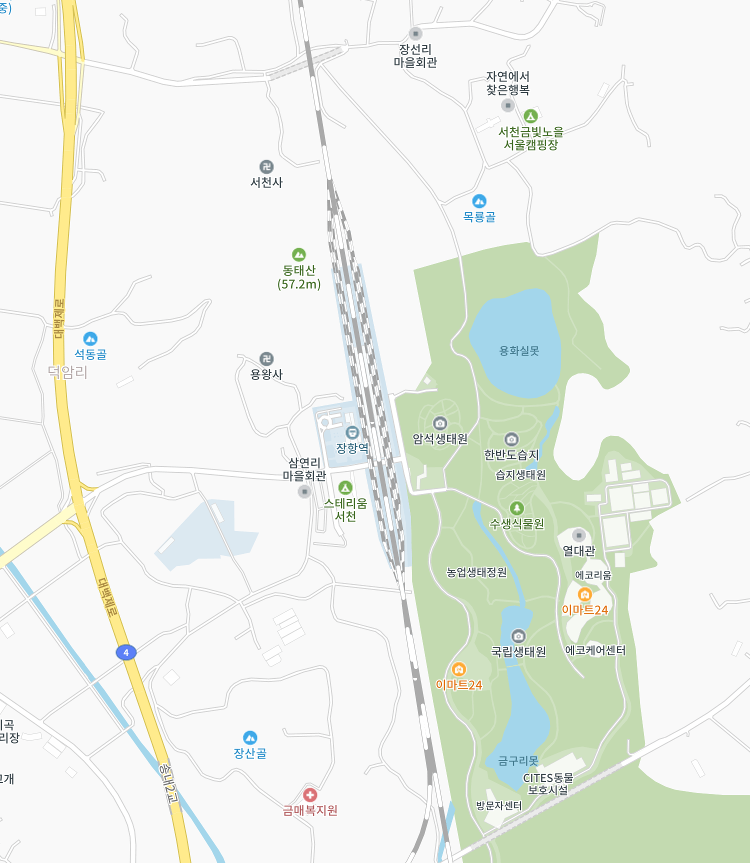 이렇게만 보면 국립생태원까지 가는 길이 가까워 보이지만, 실제로 국립생태원으로 들어갈 수 있는 길은 장항역 옆의 서문, 그리고 사진 바깥쪽의 정문입니다. 정문을 기준으로 마을 밖으로 나가 4번국도를 타고 가야 하는 길 밖에 없어 4km 정도 거리가 나옵니다. 주차를 하려면 이 루트밖에 없습니다. 진짜 걸어가기로 작정하거나 장항역 주차장에 차를 댄다고 가정하여 서문을 이용한다 해도 2.6km입니다. 이걸 걸어가라 하면 좀 부담이죠. 그래서 국립생태원이 바로 보인다 해도 실제로 걸어서 가는 것은 무리이며 차로 5분 정도를 걸려 좀 돌아가야만 합니다.