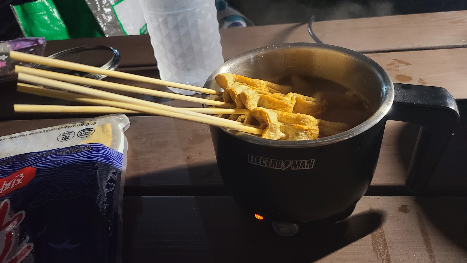 저녁 메뉴는 라면 + 김치볶음밥 + 오뎅꼬치라는 이상한(?) 조합입니다. 정확히는 라면 국물을 오뎅 국물로 바꿔 오뎅꼬치를 먹는 셈입니다. 라면을 후루룩 먹고 물과 소금을 좀 더 부어 국물을 낸 뒤 오뎅 꼬치를 투입하여 볶음밥과 함께 후루룩~ 영화를 보며 즐겁게, 가볍게 즐길만한, 뒷정리도 간편한 메뉴입니다. 캠핑 가서 폼나게 뭔가 먹어야 한다는 생각은 사실 버리는 것이 오히려 머리가 덜 아픈 길입니다.