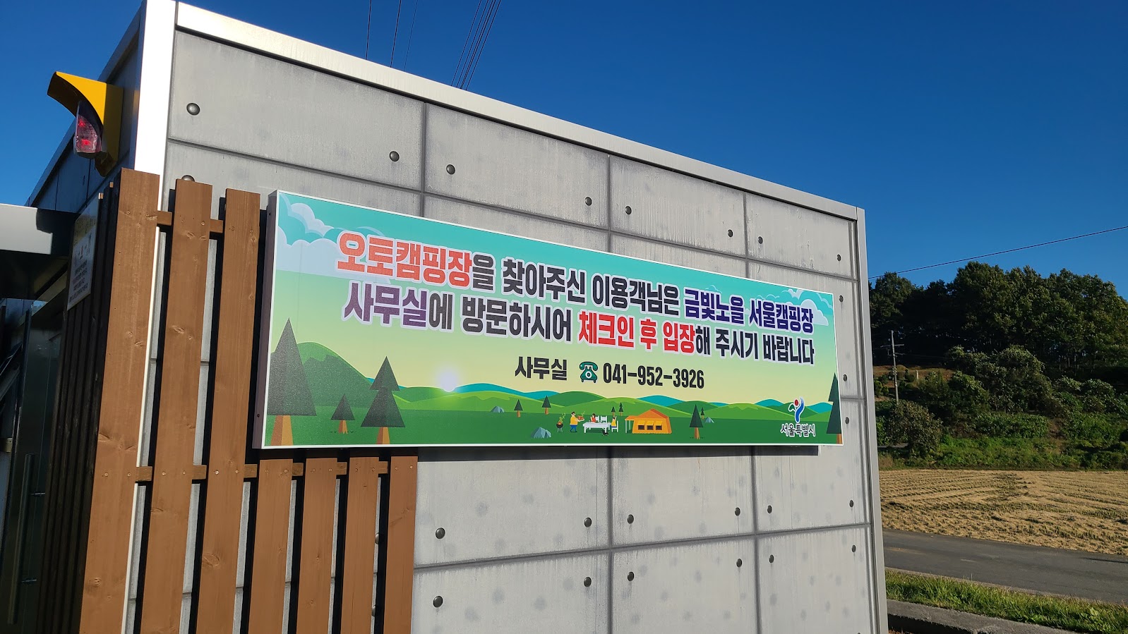 사실 이 캠핑장은 운영면에서도 좀 '덤'에 가까운 부분이 있습니다. 일단 이 캠핑장을 관리하는 '상주' 인력이 따로 없습니다. 입구에도 바로 '체크인하려면 여기가 아닌 '서천금빛노을 서울캠핑장'에 와서 하라'고 써 있습니다. 예. 서천 서울캠핑장의 부속 시설 개념으로 서천 서울오토캠핑장이 있는 셈입니다.