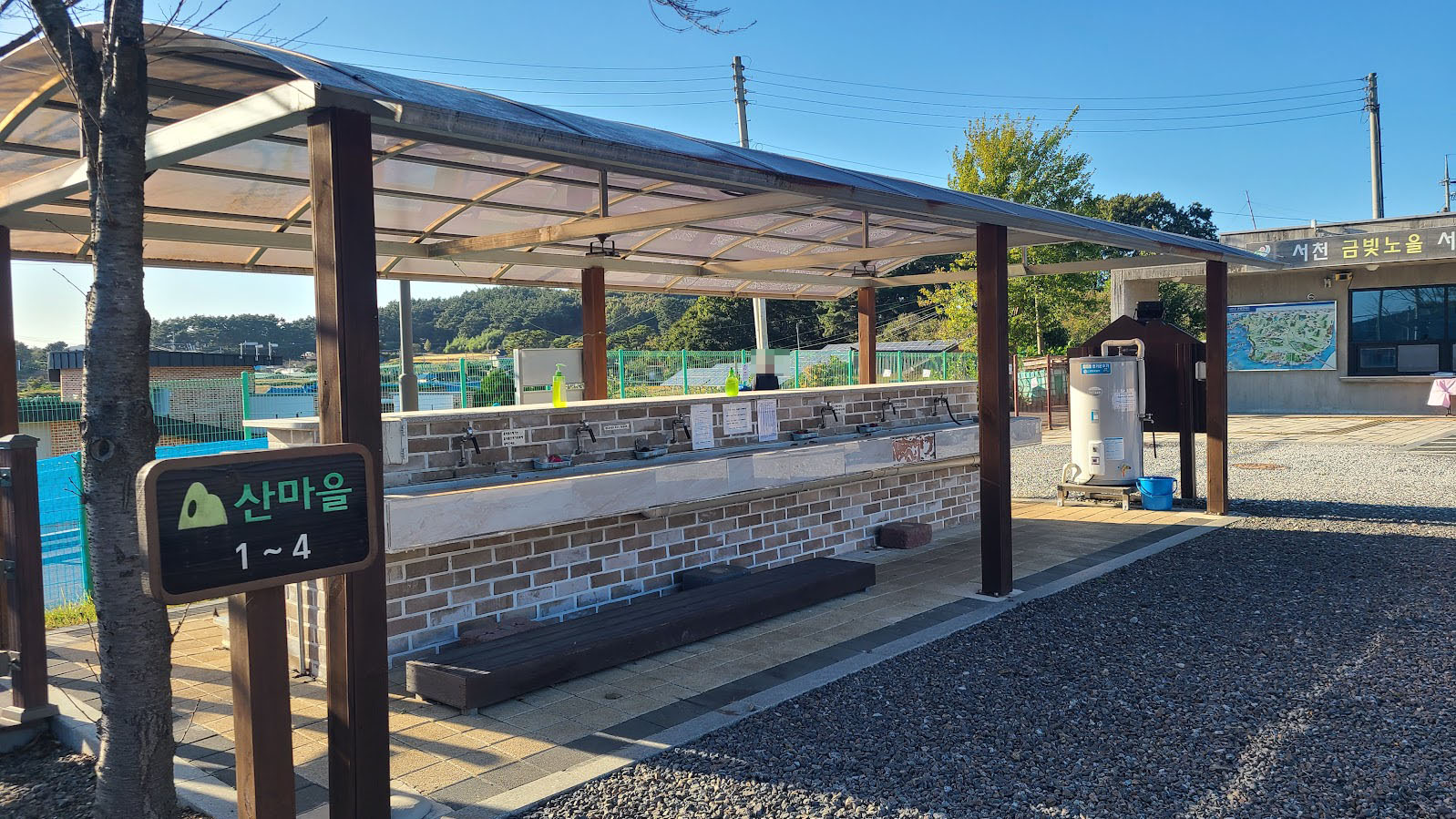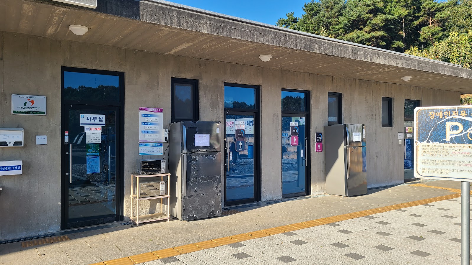 보통 사무실이나 화장실은 학교 건물을 이용하지만 이런 이유로 이 캠핑장은 따로 건물을 지었습니다. 그냥 콘크리트로 대충 지은 건물이긴 하지만 오토캠핑장처럼 가건물 수준은 아닙니다. 냉장고나 전자레인지 등의 시설도 오토캠핑장보다는 조금 더 넉넉합니다. 이전 글에도 적은 바와 같이 일단 오토캠핑장 이용자도 체크인하러 여기에 한 번은 와야 합니다.