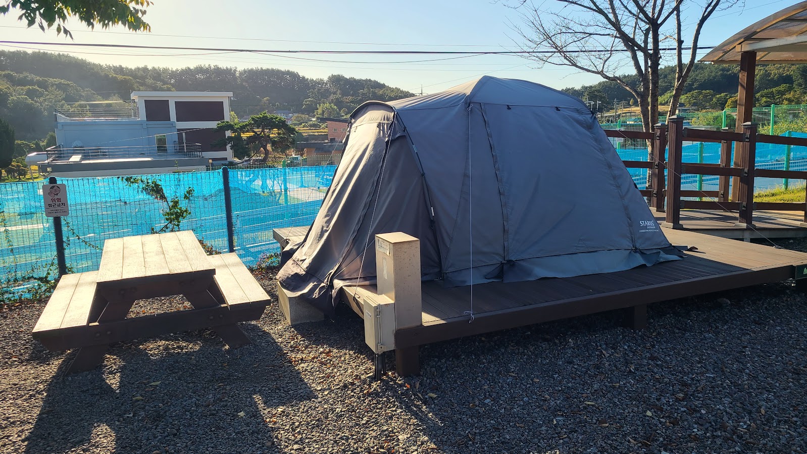 캠핑장 설명에 적었듯이 영지는 다른 서울캠핑장과 같은 데크 타입에 텐트 제공이 10 사이트, 미제공(자가 텐트) 5 사이트입니다. 이 두 가지가 전부 같은 값이라는게 좀 슬프기는 하지만 뭐 이건 운의 문제라서... 나무 테이블도 똑같이 제공하니 이 부분은 다른 서울캠핑장과 전혀 다를 바 없습니다.