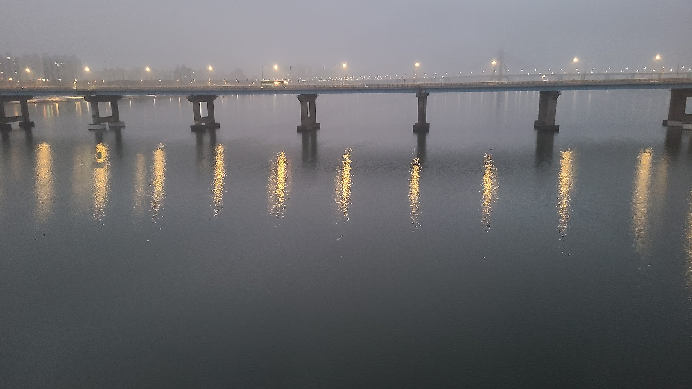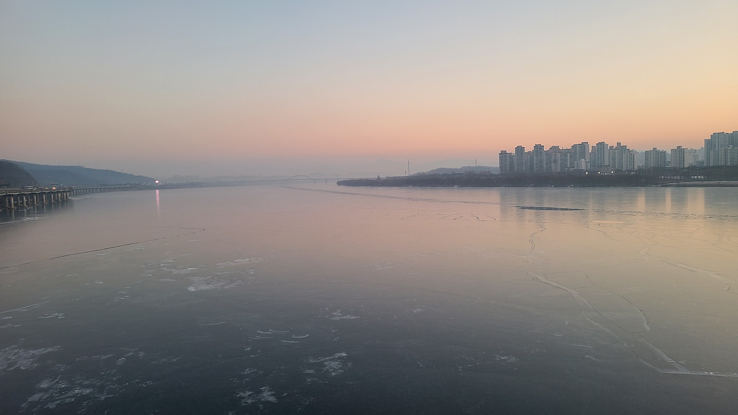 7시 초반대의 광진교에서 본 서쪽 풍경입니다. 해돋이 구경은 한파와 함께 맞이하는 것이 보통인데, 최근 며칠은 날씨가 그렇게까지 춥지는 않았습니다. 기온만 보면 해돋이 구경에는 딱 좋은 날씨입니다. 한강도 전혀 얼지 않았죠. 작년 사진과 한 번 비교해 보시죠.