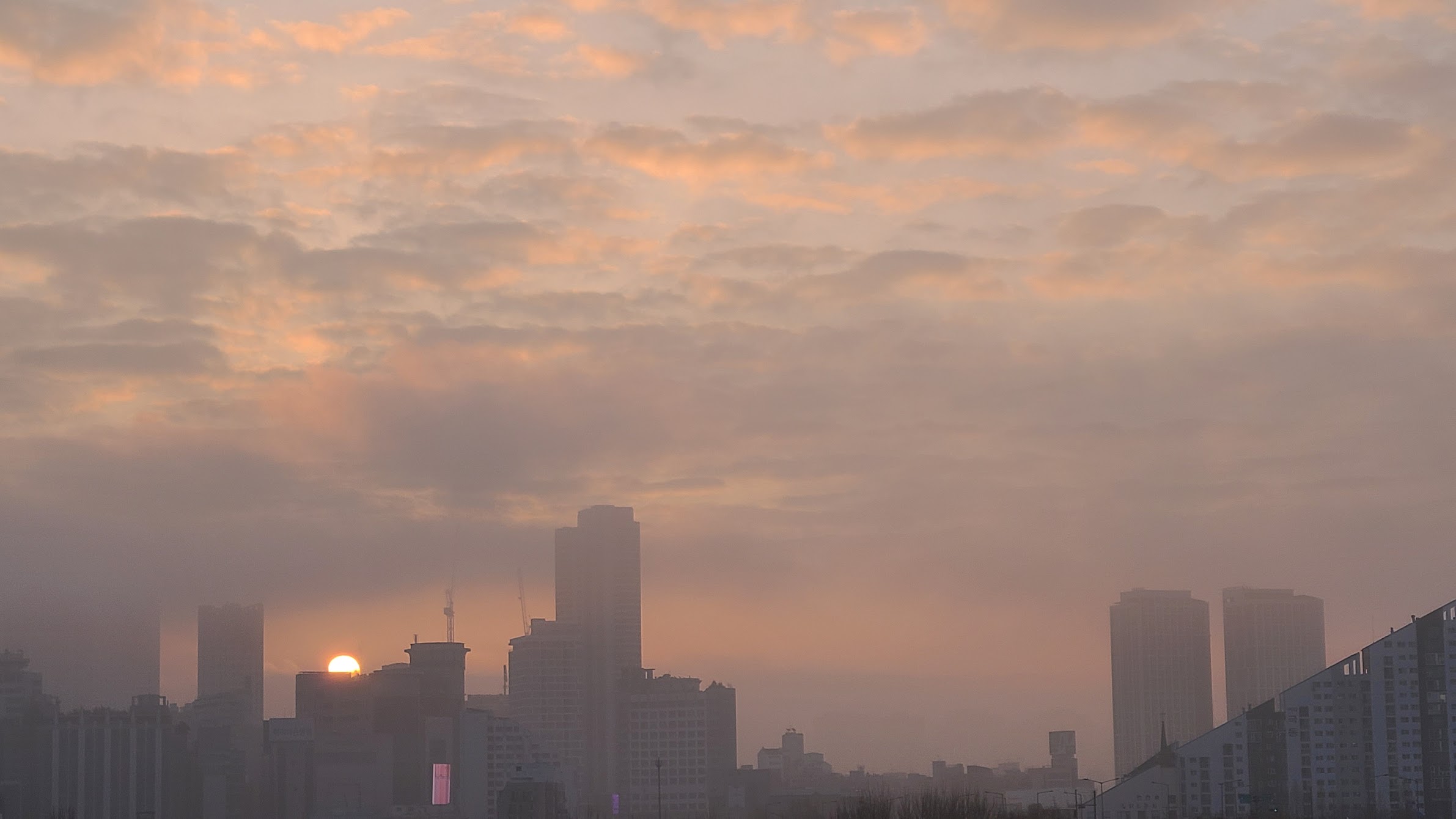 예. 구름을 뚫고 빌딩 위로 태양이 올라오기 시작합니다. 올해도 이렇게 태양은 빌딩 위에 붉게 떠오릅니다.