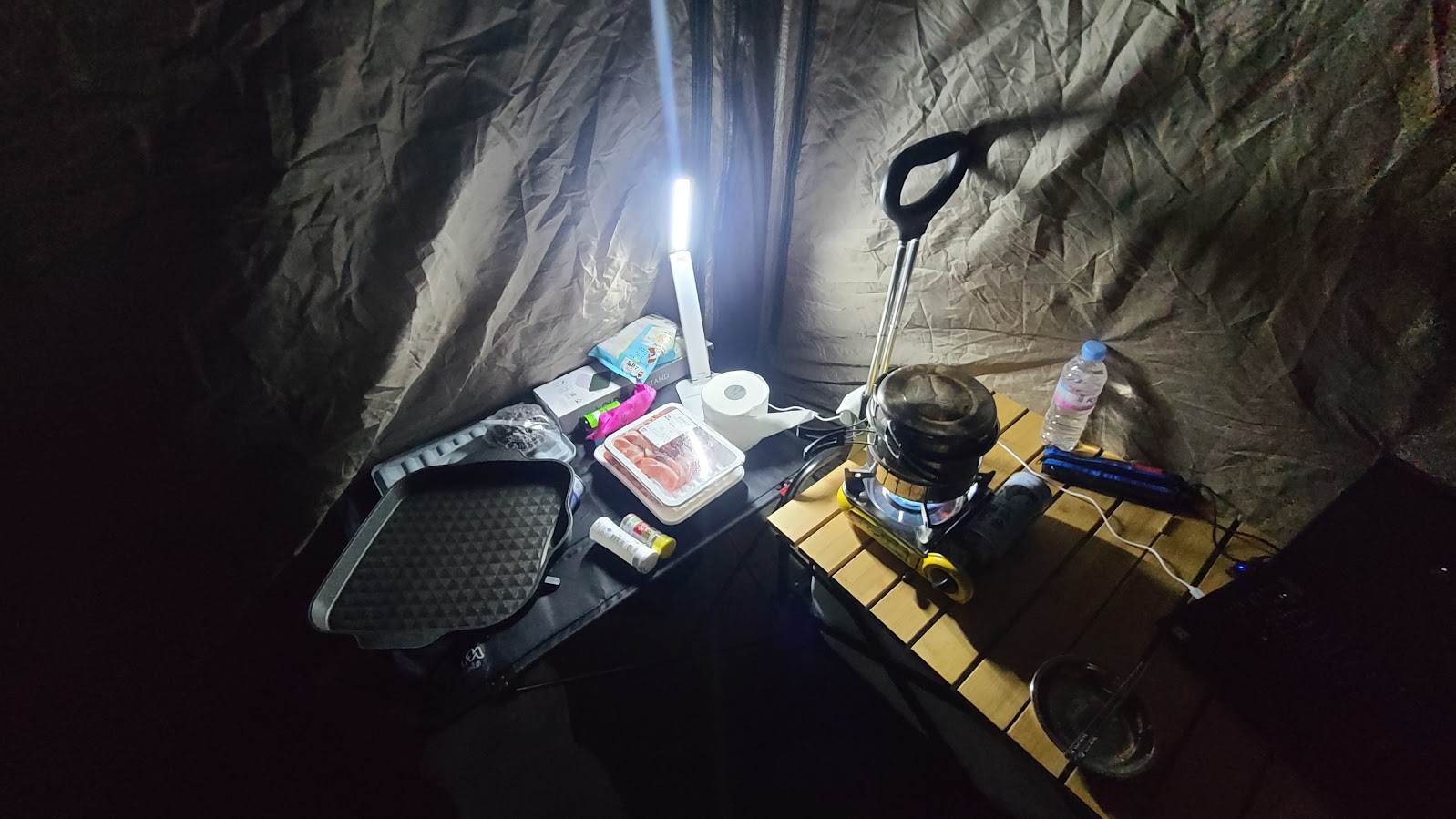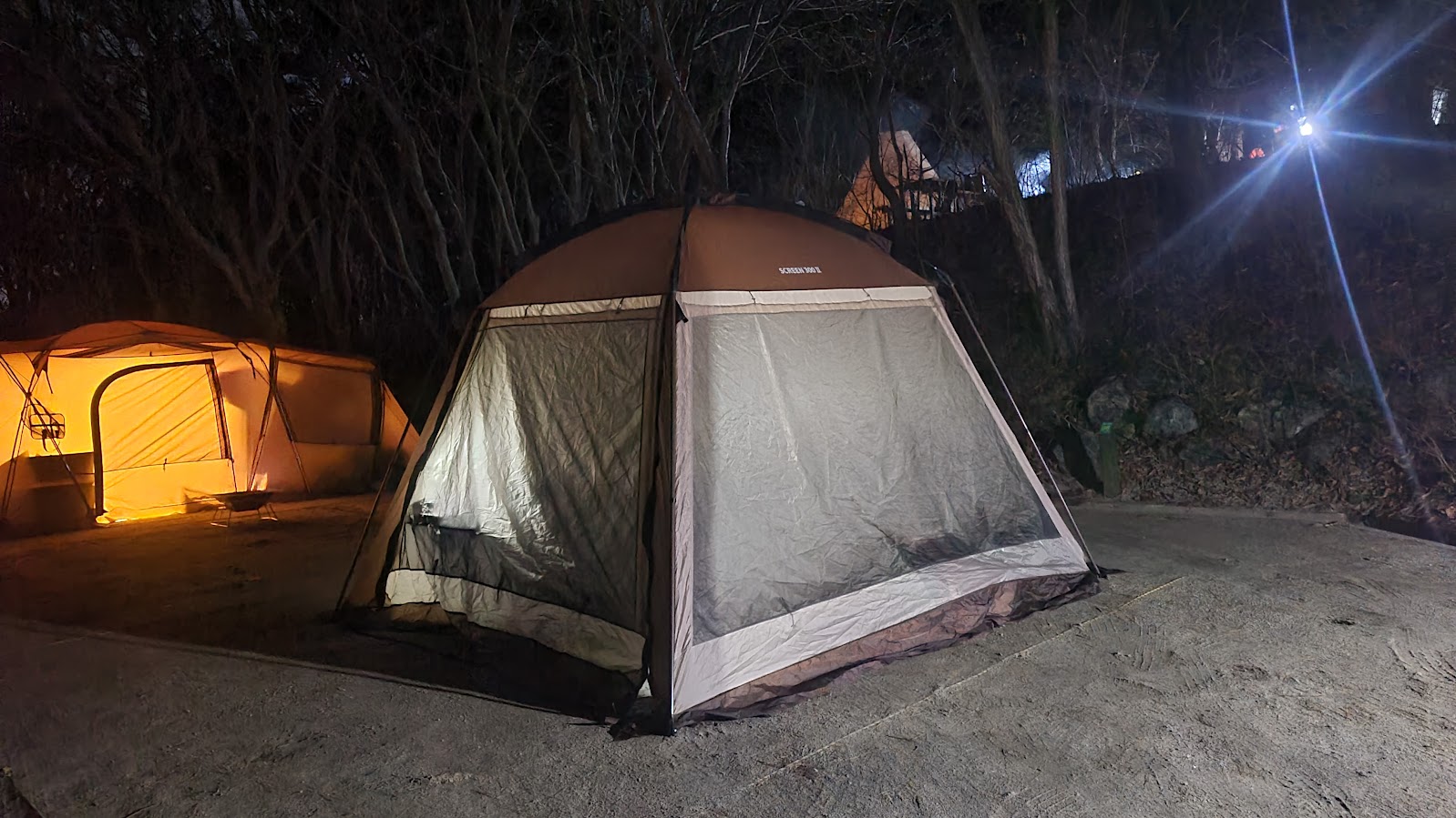 그리고 밤이 되었습니다... 옆 텐트는 조명이 밝지만 솔로 캠핑에는 그런 거 없습니다. 조명은 최소한으로.^^