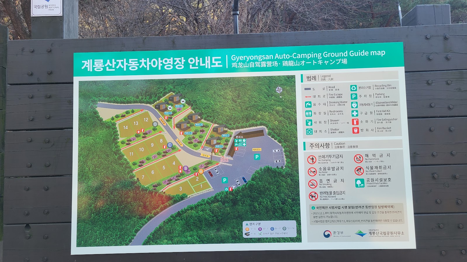 본격적으로 캠핑장을 살펴봅니다. 의외로 안내도가 심플한데, 정말 영지가 몇 개 없습니다. 일반 영지는 고작 14개. 여기에 하우스가 6동이 끝입니다. 국립공원공단 계열 캠핑장 가운데서도 규모가 작기는 손꼽히는 곳입니다. 대전, 세종, 공주, 계룡 등 이 캠핑장을 가까이 이용할만한 곳의 인구 합만 거의 200만이니 여기가 예약 전쟁이 안 일어나면 그게 놀라운 일이 아닐 수 없습니다. 수도권에서 가까운 캠핑장의 예약 전쟁 못지 않은 경쟁을 뚫어야 합니다.