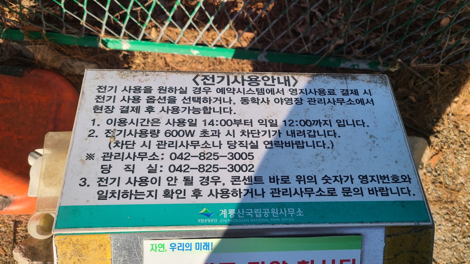 추가적으로 저 지도에서도 보이지만 계룡산 등반의 메인 루트라 할 수 있는 동학사의 입구에 있어서 매점이나 식당, 편의점은 넘쳐납니다. 물론 걸어서 가려면 정말 500m를 가야 하기에 이건 좀 무리고, 대신 차로 가면 정말 순식간입니다. 적어도 뭔가를 깜빡 잊어서 사러 가야 할 때 불편할 일은 전무합니다. 동학사 입구쪽에 계룡산온천이라는 온천도 하나 있습니다. 일단 일반 알칼리천이라 그냥 물이 특이한건 아니라 합니다만, 이번 캠핑에는 여기는 가보지 못했습니다.T_T
