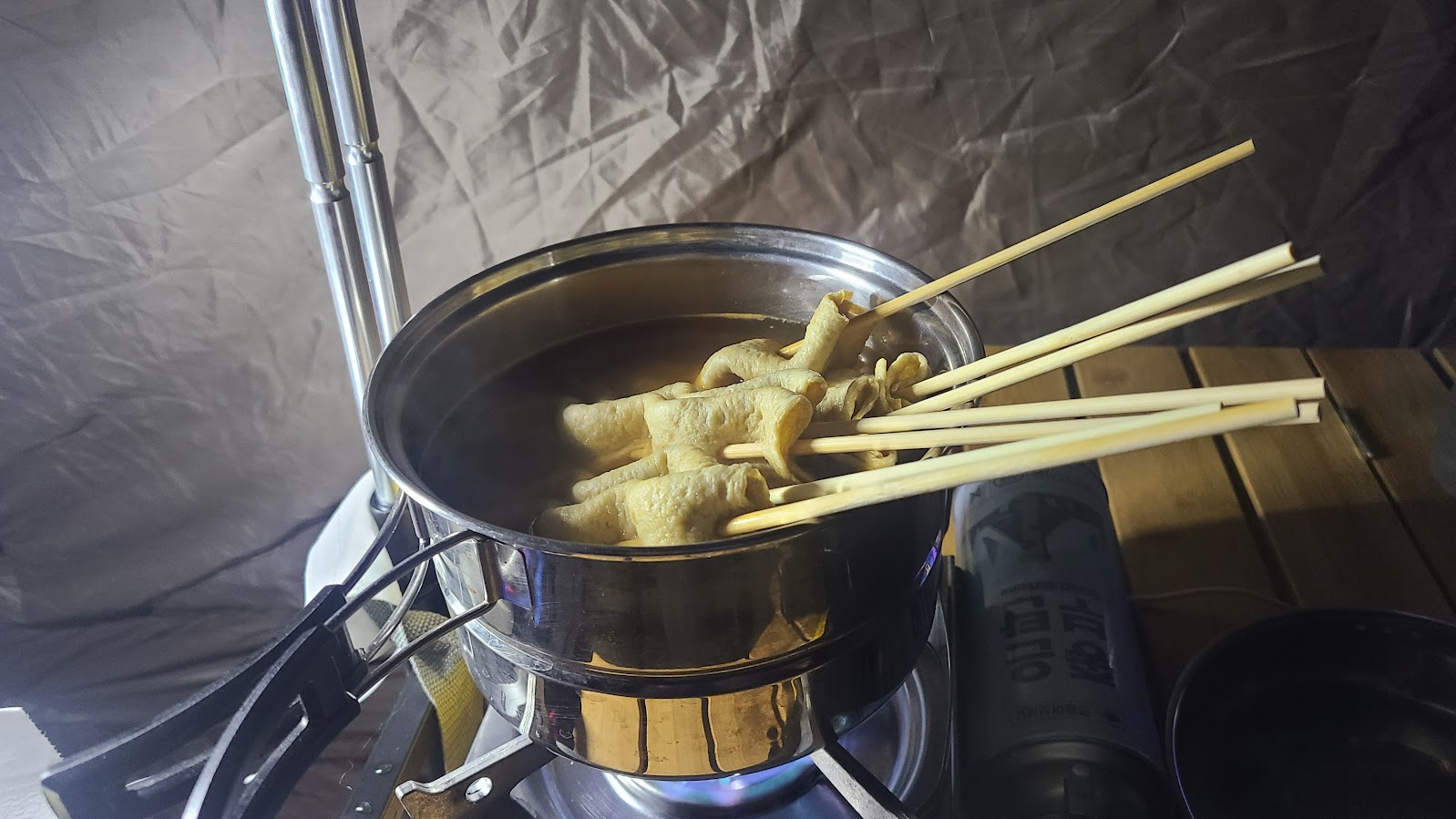 아침 메뉴도 예정과 달라졌습니다. 이 역시 원래 예정은 가볍게 라면으로 끝낼 예정이었으나, 마트에서 저렴한 오뎅 꼬치를 사와서 이걸로 대신했습니다. 옆에서 영화를 보면서 얼큰한 오뎅을 한 꼬치씩 집어 먹는것도 나름 재미죠. 이걸 새벽 5시에 했는데, 원래는 이걸 일찍 먹고 바로 철수 준비를 하여 7시 전에는 출발할 예정이었지만... 마침 그쳤던 눈이 다시 내리기 시작하는데다, 나갔다 오니 귀차니즘이 생겨 다시 이불 속으로 들어가 7시 30분까지 쿨쿨 잤습니다.