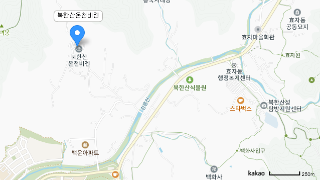 지도를 꺼내 들어 좀 확대를 해서 보겠습니다. 오른쪽에 '북한산성'이라는 글자가 보일텐데, 북한산의 북쪽 주요 등반 루트가 저 북한산성입니다. 우이동이나 정릉 루트만큼 나름 차를 가지고 오기도 좋고 먹고 마시기도 좋은 루트죠. 북한산성 주차장에서 차로 5분 남짓, 거리로도 2km 정도라서 정말 하산한 뒤 씻으러 가기도 좋은 거리입니다. 다만 거리가 있다보니 대중교통으로 등반하는 등반객의 이용이 좀 불편한데, 도로까지 가서 버스를 타도 두 정거장에 다시 1km 가까이를 걸어서 올라가야 하기 때문입니다.