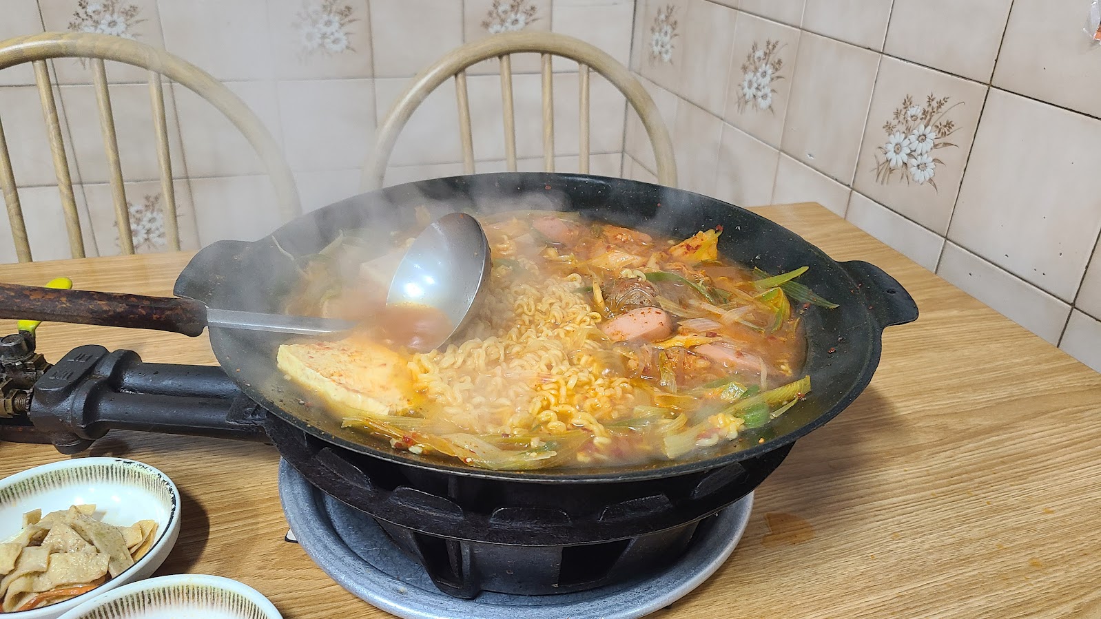 파주식, 즉 삼거리식당의 경우 1인분에 라면사리 2개라는 정말 부대찌개 라면에 환장하는 사람의 메뉴를 받아줍니다만(물론 좀 괴상한 사람 취급 받을 수는 있습니다.), 오뎅식당은 그런 거 없습니다. 사실 여기는 부대찌개 뚜껑도 맘대로 열어서는 안 되는 곳이라서, 좋게 말하면 먹는 사람은 뭐 할 것이 없는 편한 곳이고 나쁘게 말하면 자기 입맛대로 커스터마이징이 안 되는 곳이 바로 오뎅식당입니다. 그래서 라면사리는 딱 하나. 주문을 하면 1인분 기준 라면사리 반 개 두 개가 쪼개진 상태로 위에 올라가고, 뚜껑을 닫고 보글보글 끓입니다. 사리는 마지막에 풀어서 불지 않게 만들어 주기에 걱정하지 않으셔도 됩니다.