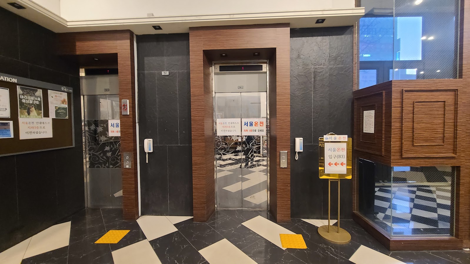 어쨌거나... 이런 건물 지하 3층에 온천이 있습니다. 의외로 지하가 깊어서 가장 아래에는 어린이용 수영교실까지 있습니다. 위로는 예식장과 부페 등이 있습니다. 딱 입구부터 이발소 표시 없으면 그냥 예식장 있는 건물처럼 보이기에 뻘쭘할 수 있지만 문을 열고 들어와서 엘리베이터 앞을 보면 일단 온천 입구구나...하는 생각은 들 것입니다.