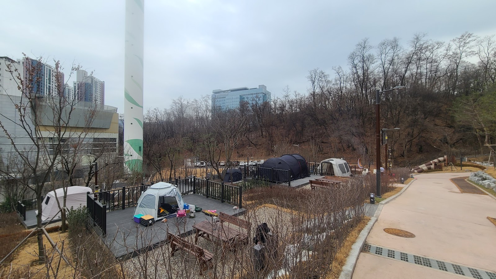 그리고 캠핑장 전체에서 보이는 이 굴뚝... 굴뚝 사진만 갖고도 이 시설이 뭔지 다들 예상이 가실 것인데 은평환경플랜트, 그냥 나쁘게 말하면 쓰레기 소각장입니다. 냄새가 나거나 하는 일은 없습니다만 일단 풍광을 좀 더 나쁘게 하는 원인이 되기도 합니다. 사실 이런 시설이 있으니 그 옆에 보상 차원으로 캠핑장같은 것을 둔다고 볼 수도 있겠죠.
