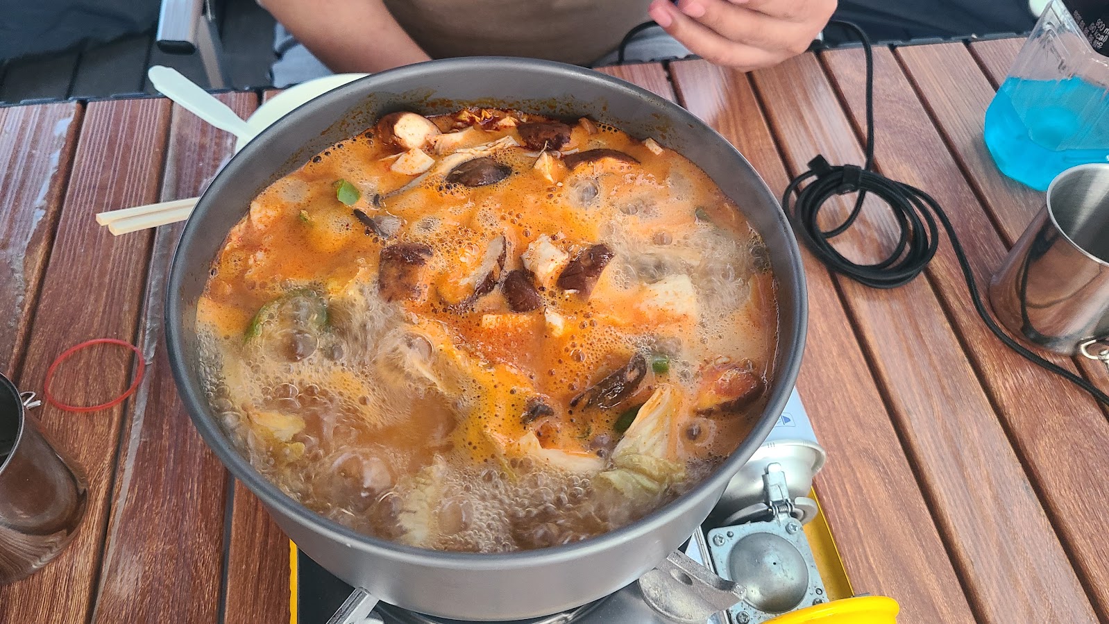 전날 먹지 못한 버섯 칼국수가 아침에 등장합니다. 사실 아침 메뉴는 오뎅식당 존슨으로 예정했으나 이걸로 바꾼건 냉동 보관한 육수가 전혀 녹지 않았다는 슬픈 이유 때문입니다.T_T 2인분 면이 양이 적어서 비상용으로 들고간 우동사리 하나를 더 투입하니 나름 배가 차 오릅니다.