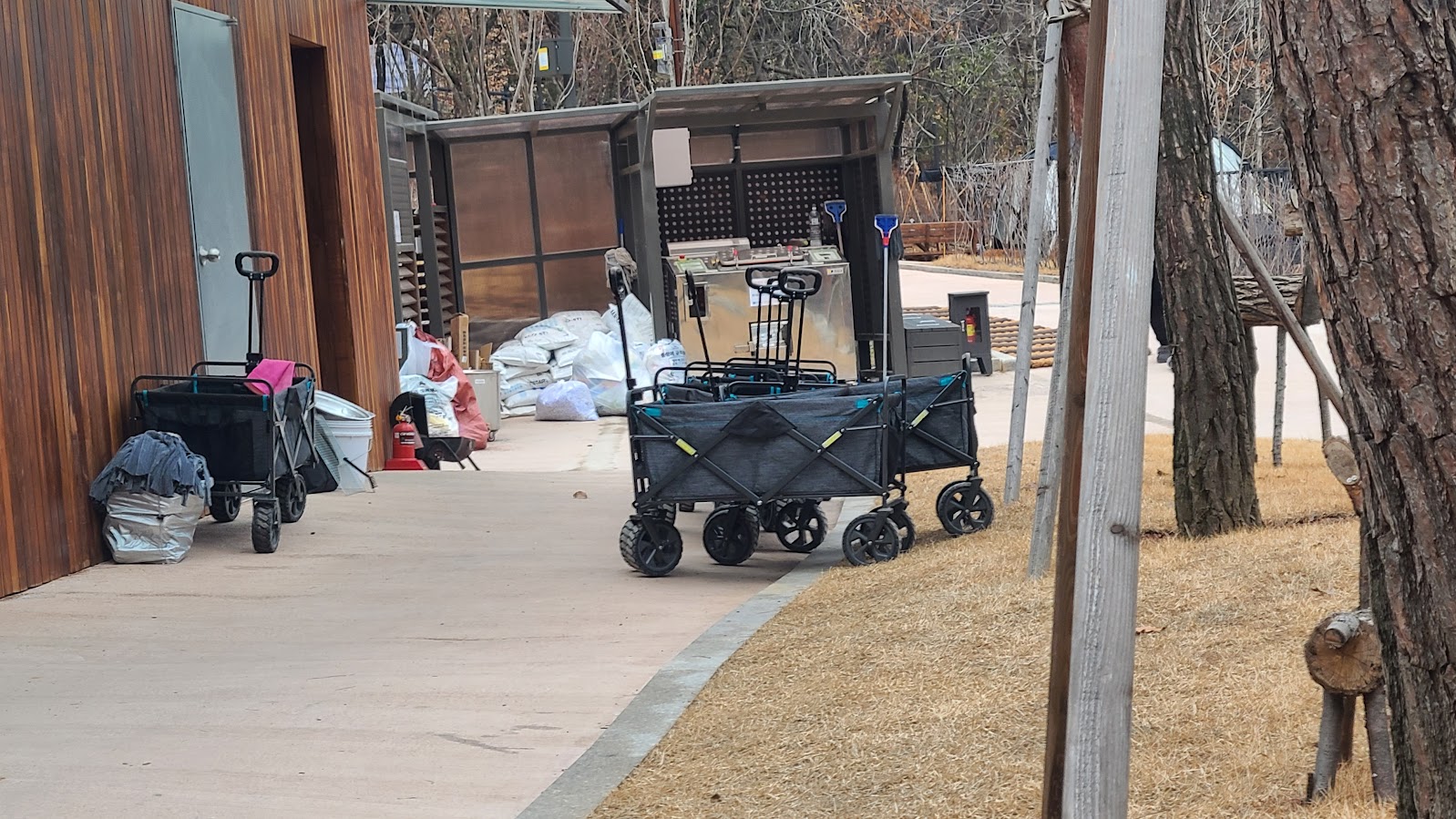 하지만 너무 깊게 슬퍼할 필요는 없습니다. 관리사무소 앞에서 웨건은 대여해줍니다. 심지어 1대 뿐이지만 대형 전동 카트도 있습니다. 전동 카트는 조작법 숙지가 필요하고 느리기는 하지만 적재량이 많은데다 힘은 안 들고, 웨건은 힘은 들어도 직접 들고 가는 것 보다는 낫습니다.