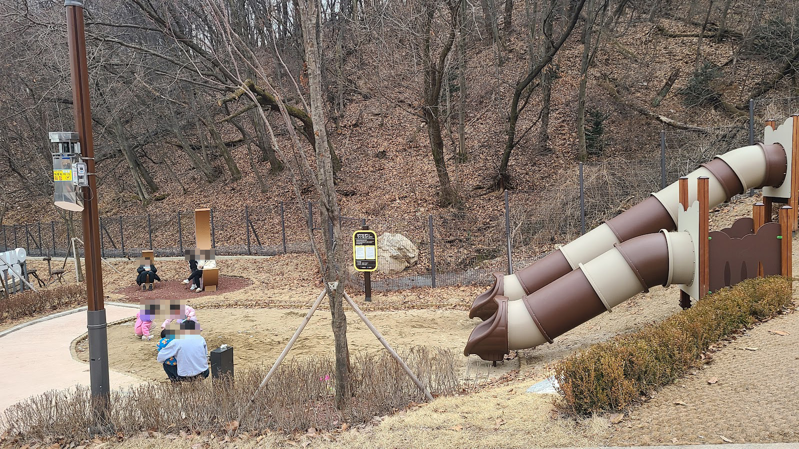 캠핑장이 산비탈에 있어서 넓은 땅은 없고 그래서 애들이 뛰어 놀만한 곳이 좀 부족합니다만, 다행히도 가족캠핑장답게 놀이터는 있습니다. 미끄럼틀과 모래밭이라는 단촐한 구조지만 그래도 애들에게는 즐거운 공간이죠. 나름 인기 있는 장소입니다.