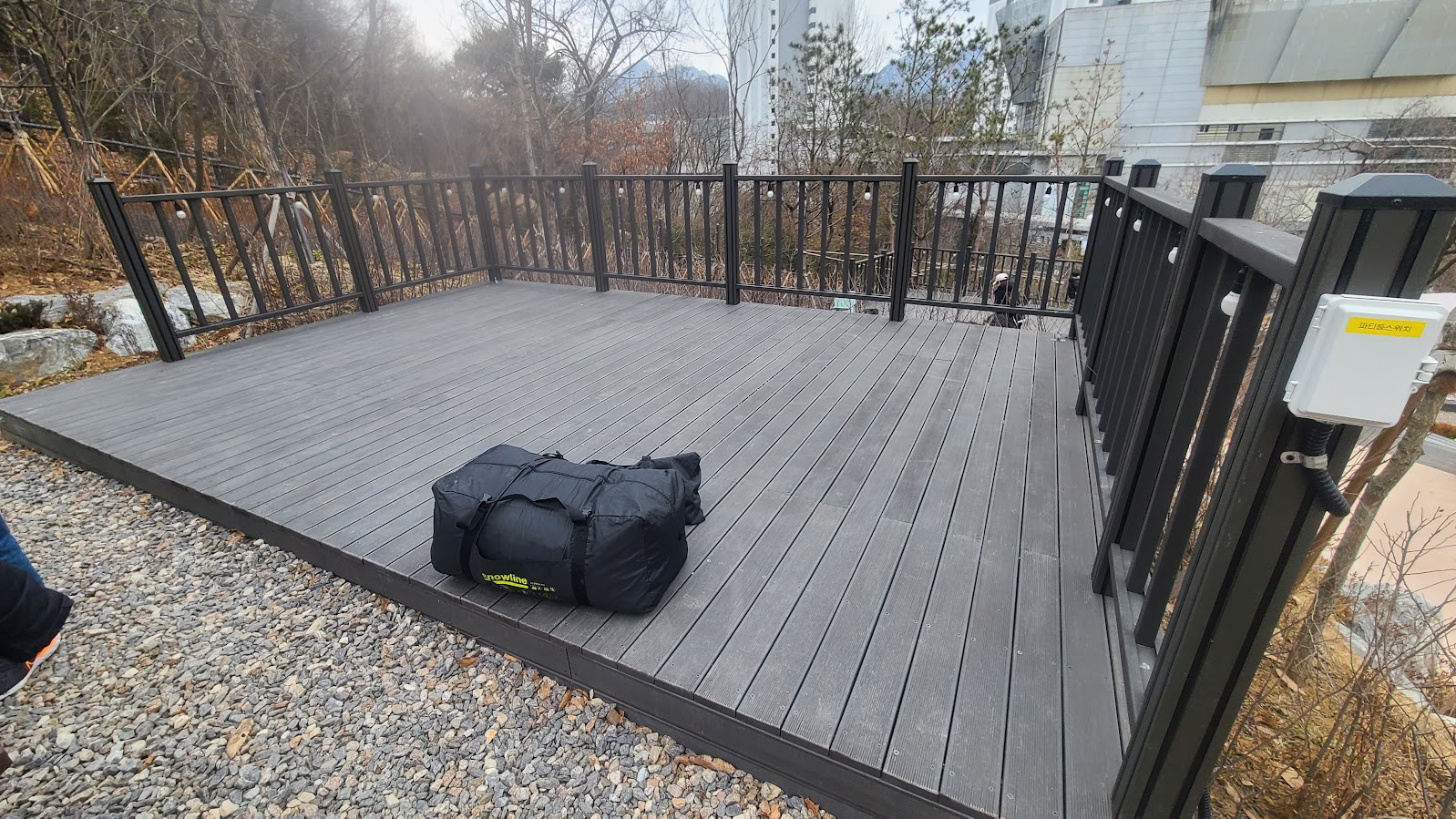 데크는 대략 6m 정도의 텐트를 수용하는 크기라 보시면 됩니다. 그 이상의 크기를 갖는 텐트라면 좀 애로사항이 꽃피는데, 그나마 하나 위의 사진처럼 난간이 없는 곳이면 좀 오버해서 치는 것도 가능하지만, 이런 영지처럼 세 면이 막힌 곳이면 답이 없습니다. 그리고 이렇게 난간이 갖춰진 곳은 LED 무드등도 있는데, 밝은 것은 좋지만 이게 밤 10시에 딱 꺼지지는 않는답니다.