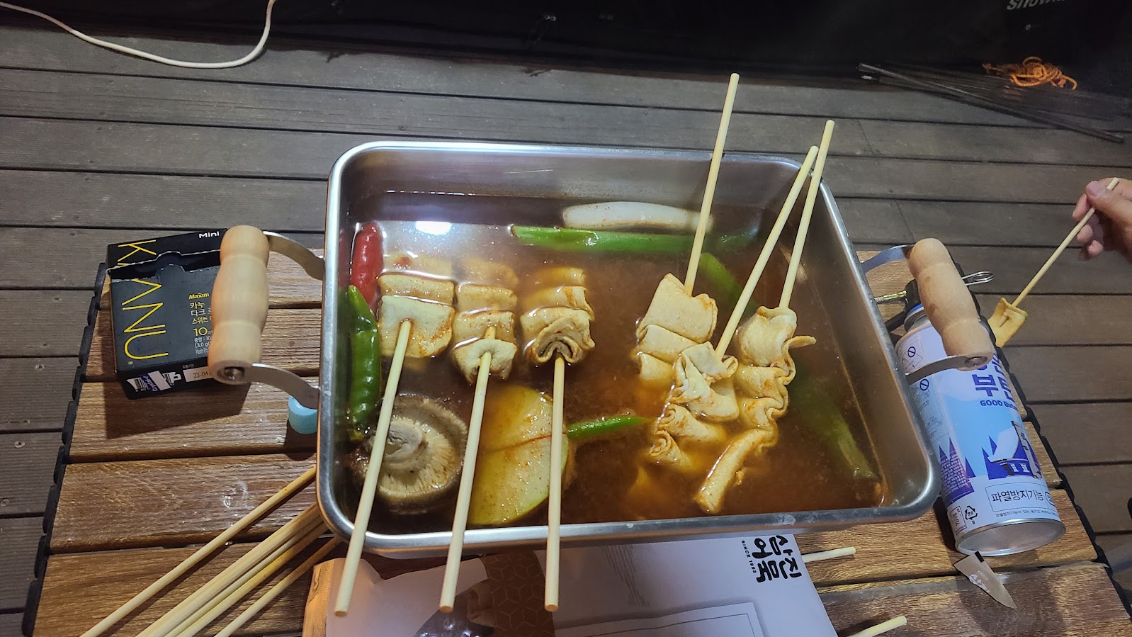하여간 이렇게 해는 저물고... 밥은 먹어야 하지 않겠는지요? 사실 밥 메뉴는 따로 정해 놓은 것이 있지만 이번에는 그냥 깔끔하게 오뎅 꼬치로 끝냈습니다. 원래는 저기에 버섯칼국수를 예정했지만 배터지게 먹지 말자는 이유로 배치를 바꿨습니다. 오뎅 꼬치는 시판품을 썼지만 국물 재료는 직접 준비해 냈습니다. 나름 매운 오뎅을 만들어 먹었고, 인당 10꼬치를 먹으면 배가 빵방해집니다.