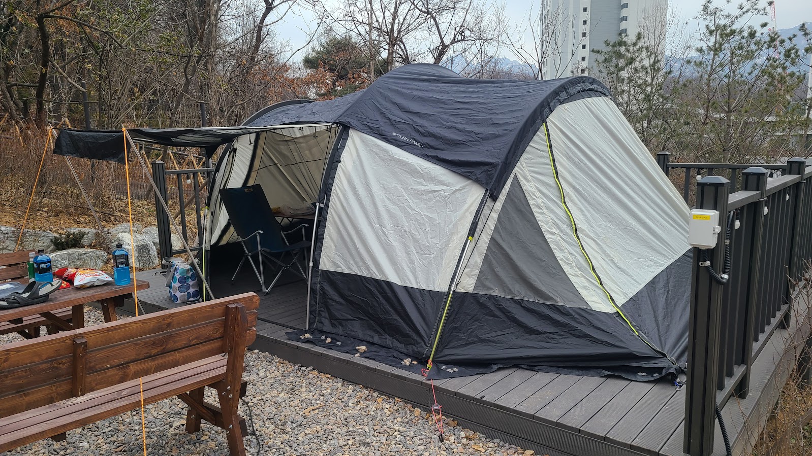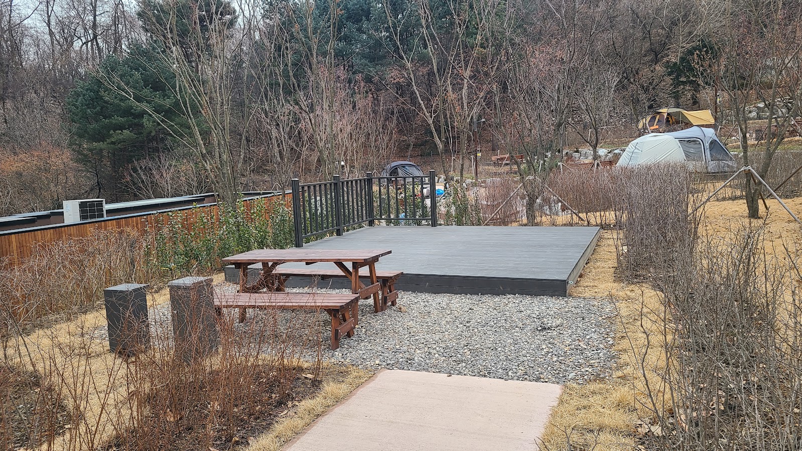 영지는 전부 데크입니다. 겨울에 땅에서 냉기 많이 올라올까, 비나 눈이 온 뒤 땅이 질지 않을까 걱정할 필요가 없습니다. 데크 이외의 부분도 쇄석이라서 물은 잘 빠집니다. 즉 영지 퀄리티는 꽤나 좋습니다. 테이블은 일반형 영지도 있지만 등받이가 있는 곳도 있습니다. 이건 뽑기운이라 보시면 됩니다.
