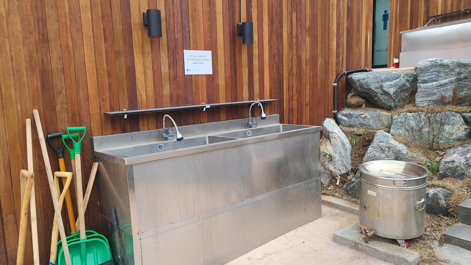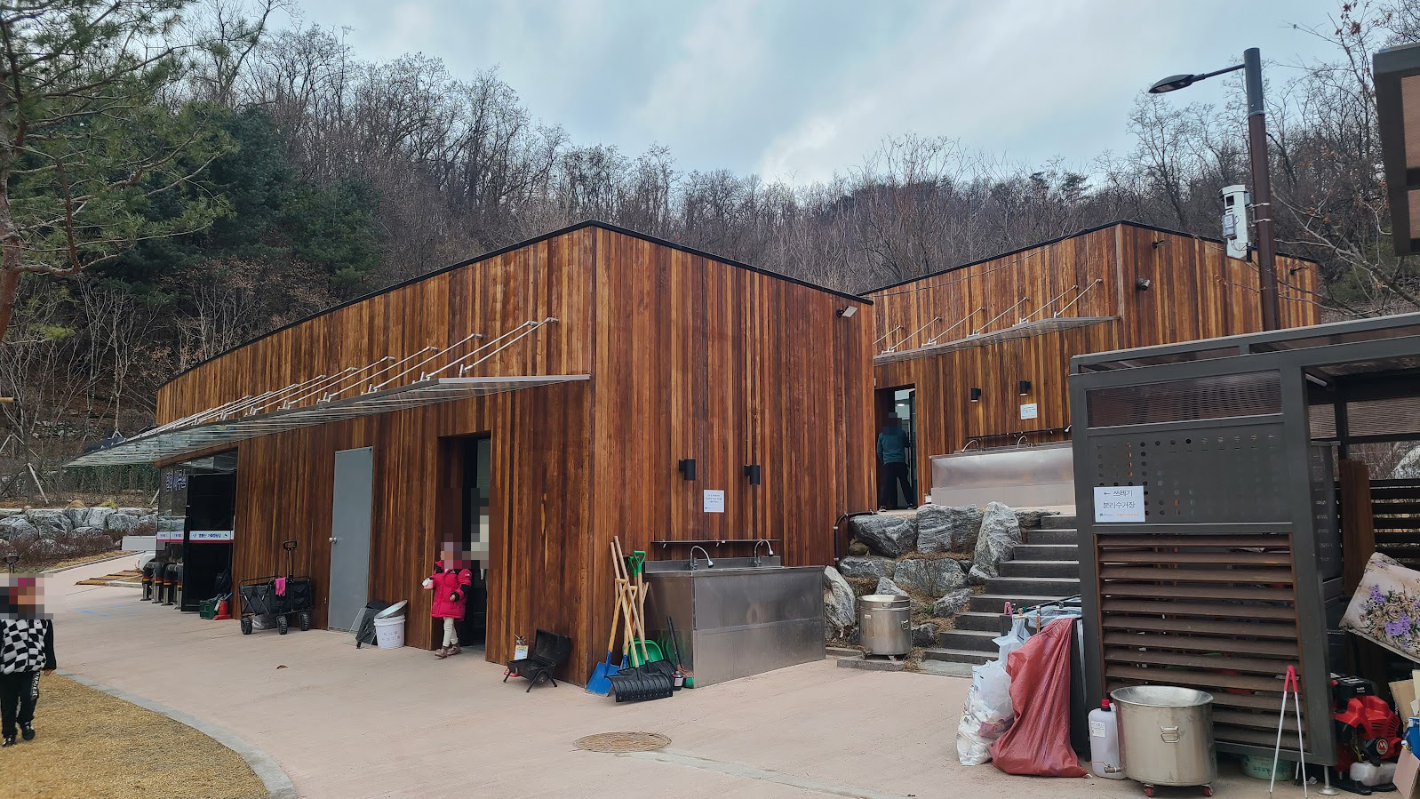 화장실과 개수대는 일단 관리사무소가 있는 중앙에 몰려 있습니다. 여기에 실내 개수대와 화장실, 샤워장이 있습니다. 이 주변으로도 야외 개수대가 있고, 여기 오기 힘든 윗쪽이나 아래쪽에도 간이 개수대는 있습니다만 지금은 계절이 계절이나 운영을 안 합니다. 즉 동계에는 그냥 귀찮아도 중앙으로 와야 합니다. 다행히도 따뜻한 물은 그런대로 잘 나오며, 전자레인지도 있습니다.