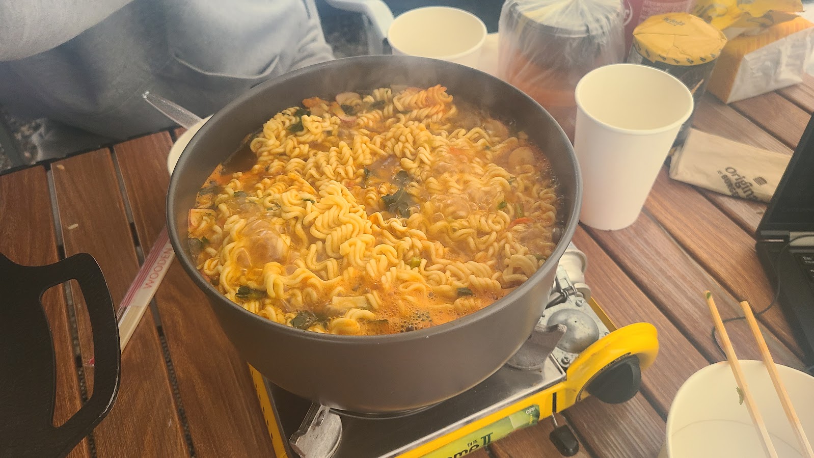 어쨌거나 밥은 든든하게~ 대게마을과 십원 한 장 관계가 없는 대게라면을 끓이고 계란볶음밥을 그리들에 볶습니다. 3인분까지는 그냥 저 그리들에 쓱쓱 볶을 수 있습니다. 두 명이서 라면과 볶음밥 1.5인분씩을 해치우고... 비를 쫄쫄 맞으며(실제로는 짐 옮기기 + 텐트 최종 해체 및 정리때만 비를 맞았습니다.) 철수를 진행했습니다. 비오는 날 철수는 기분은 거시기하지만, 그래도 그 전까지는 참 즐거운 캠핑은 맞습니다.^^