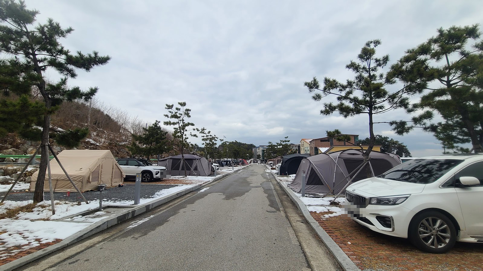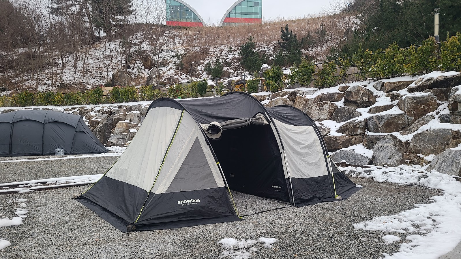 추암 캠핑장의 또 다른 장점은 이 영지인데, 전반적으로 영지가 널찍합니다. 오토캠핑 영지도 널찍하고, 일반영지도 각 구석에 있는 영지는 정말 잘하면 거실형 텐트 두 개가 들어가는 수준입니다. 쇄석 영지라 물빠짐도 괜찮아서 눈이 온지 얼마 안 됨에도 불구하고 땅 걱정은 정말 안 했습니다.