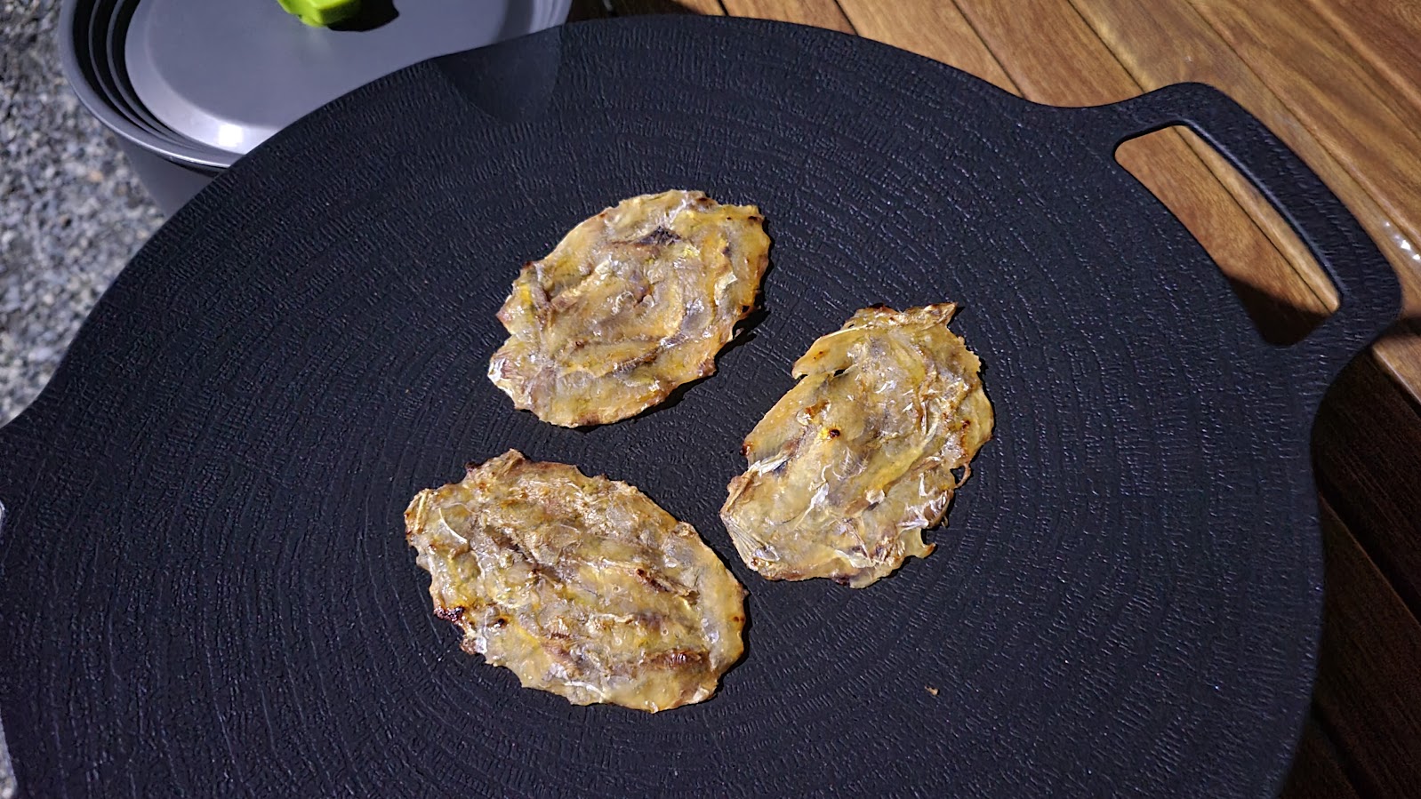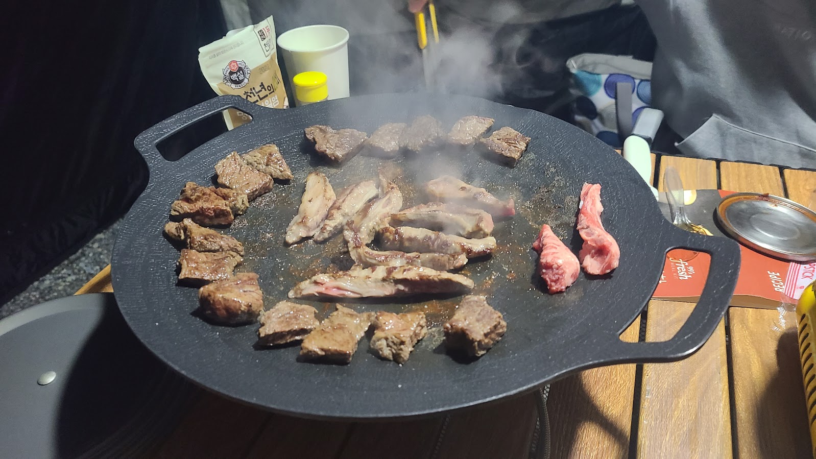 캠핑을 왔으면 먹어야죠. 점심을 겸해 차가워진 햄버거를 씹으며 그리들에 쥐포를 구워서 영화를 보며 우적우적 씹습니다. 그리고 저녁에는 본격적으로 괴기를 굽는데... 소 갈비살과 살치살을 지글지글 굽습니다. 최고급은 아니지만 그래도 잘 구운 좋은 부위 괴기는 감칠맛이 돕니다. 대신 이제 나이를 먹어서 먹는 양이 줄어서 돼지 목살은 뜯지 않았습니다.T_T