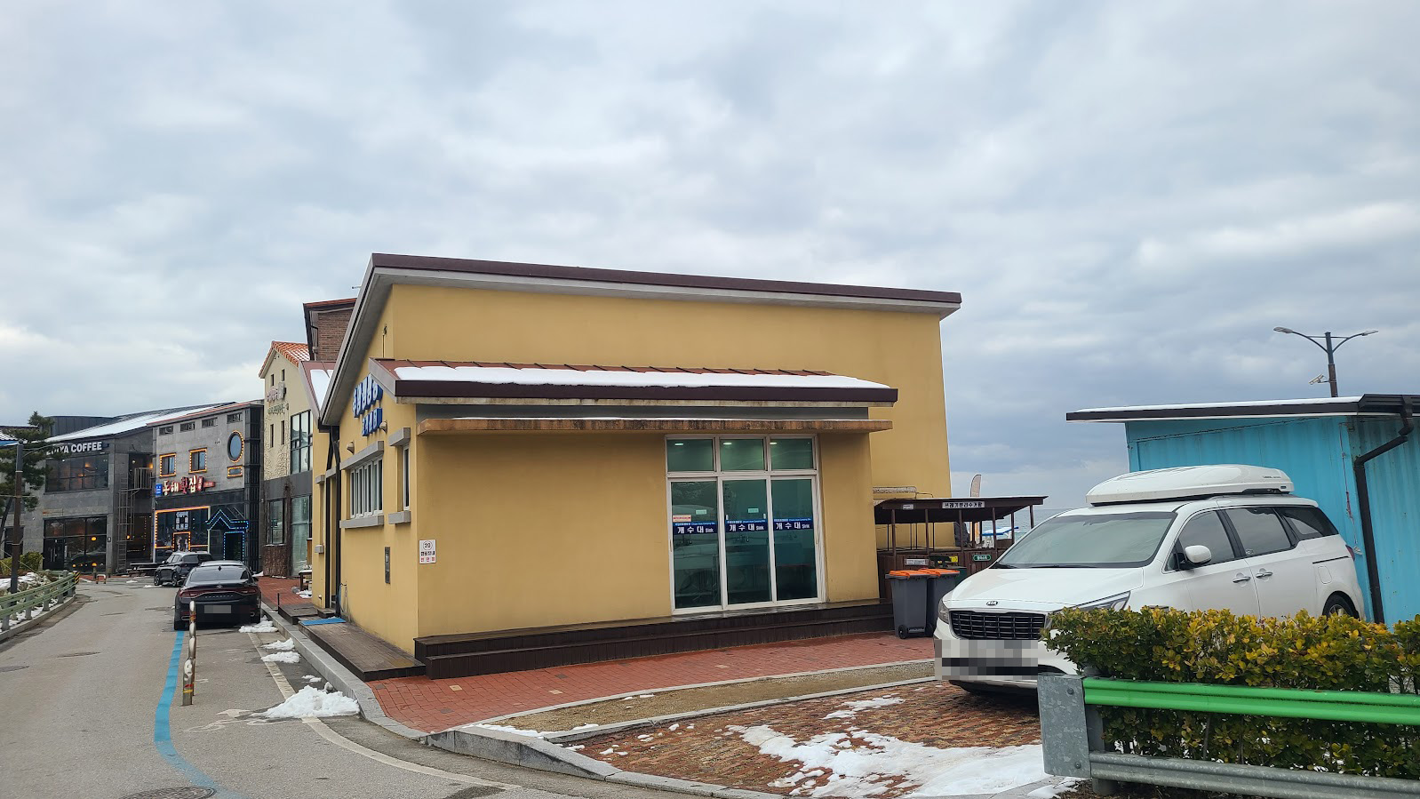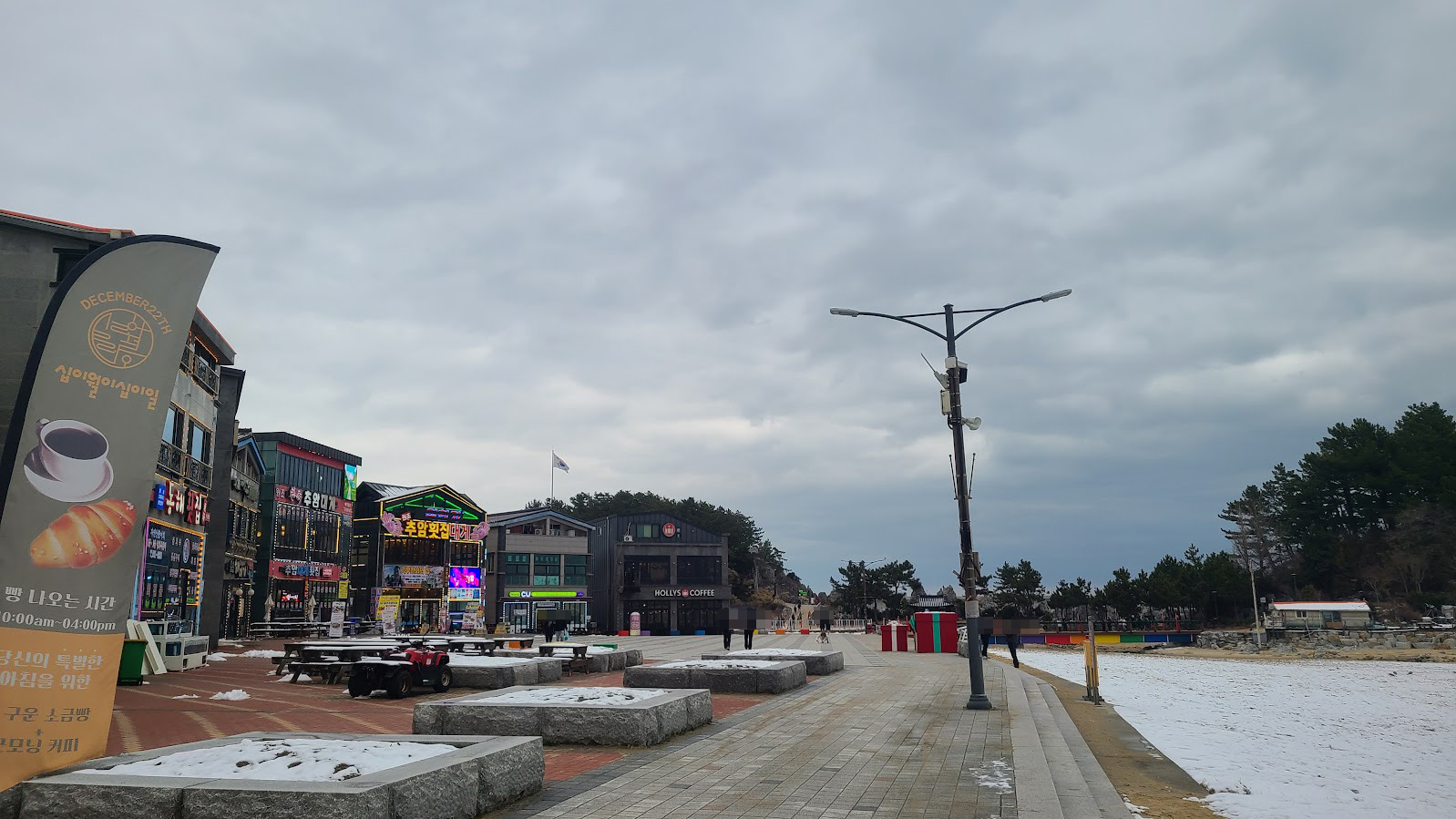 캠핑장이 추암해변에 완전히 일체화된 상태라서(차량 통제는 하지만 사실 사람 통제는 못 합니다.) 보안 문제는 좀 거시기하지만, 대신 해변에 있는 여러 상점을 이용하기는 편합니다. 저기 사진처럼 할리스도 있고 CU도 있으며 옆에는 횟집들이 있습니다. 걸어 갈 수 있는 거리에는 러시아 대게마을도 있죠. 물론 캠핑 와서 이걸로 때울 분이야 많지야 않겠습니다만, 최소한 편의점이 정말 가까이 있다는 것은 매우 바람직한 일입니다. 따뜻한 커피라도 언제든지 사다 마실 수도 있구요.