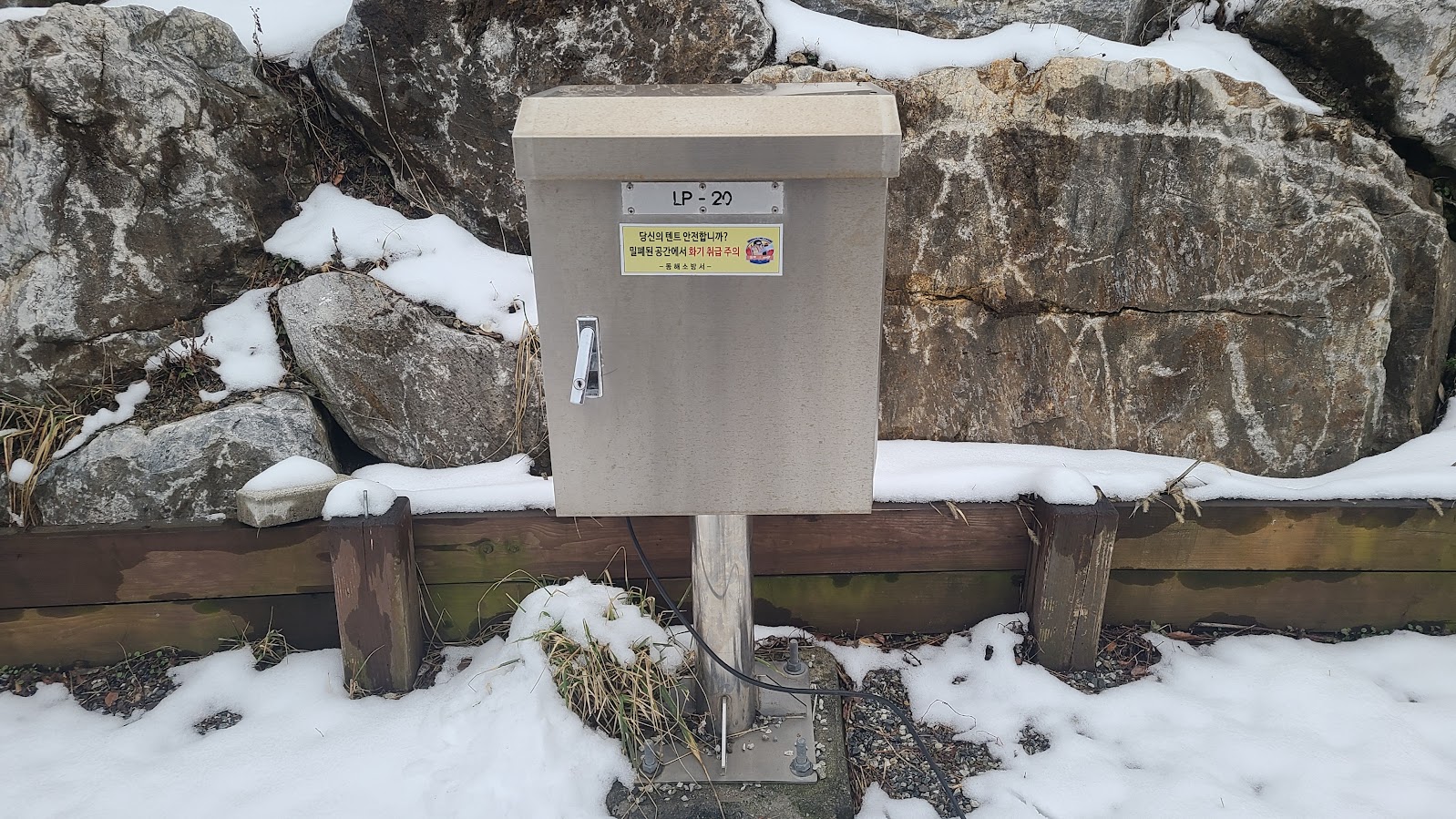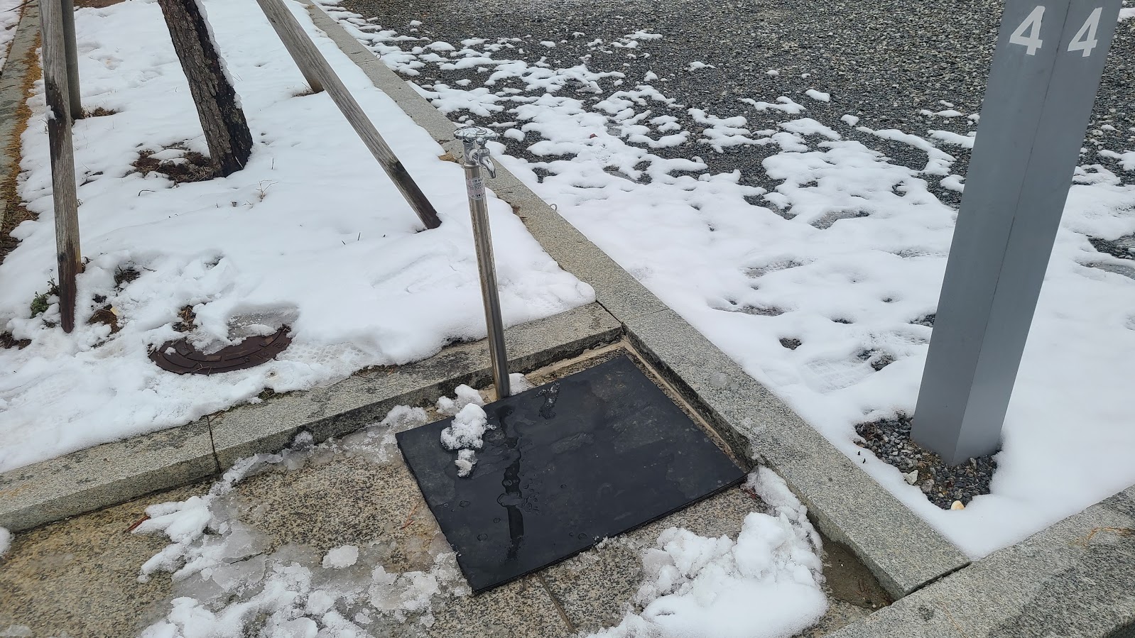 오토캠핑 영지의 또 다른 장점은 이렇게 수도를 추가로 쓸 수 있다는 점입니다. 개수대는 아니라서 그냥 물받이 목적이지만 있는 것과 없는 것의 차이는 크죠. 다만 문제는 겨울에는... 당연히 '수돗물 잠가' 모드입니다. 3월까지는 내내 이러하니 초봄 캠핑까지 이 기능은 없다 생각하셔야 합니다.
