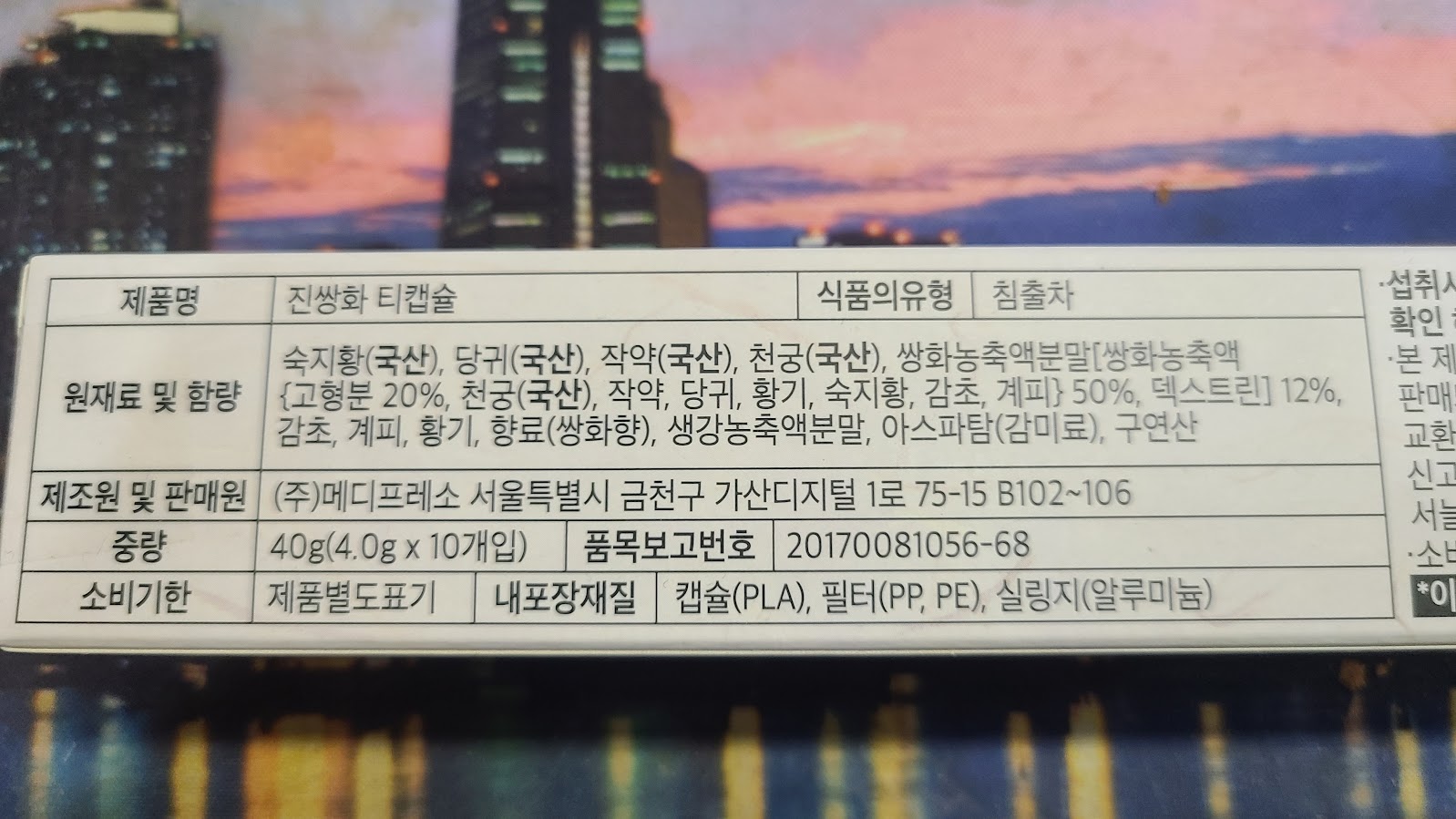 이 쌍화차의 성분표를 보면 알 수 있습니다. 일반적인 인스턴트 스틱 쌍화차의 경우 쌍화농축액 분말을 사용하는데, 이 캡슐은 이 농축액 분말과 함께 쌍화차의 성분 원물을 함께 넣었습니다. 그래서 분명히 성분상으로는 인스턴트보다는 제대로 쌍화차에 가깝긴 하겠지만 맛은 인스턴트 쌍화차에 가깝게 나게 됩니다. 또한 설탕 대신 아스파탐이 들어 있는데, 이것이 좀 이질적인 단맛의 이유입니다. 추출 시간을 고려하면 부피도 크고 녹는 것도 보장하기 어려운 설탕 대신 감미료가 들어가는 것은 어쩔 수 없다 치지만 차라리 아스파탐 말고 스테비아를 넣었으면 어땠을까 하는 생각은 듭니다.