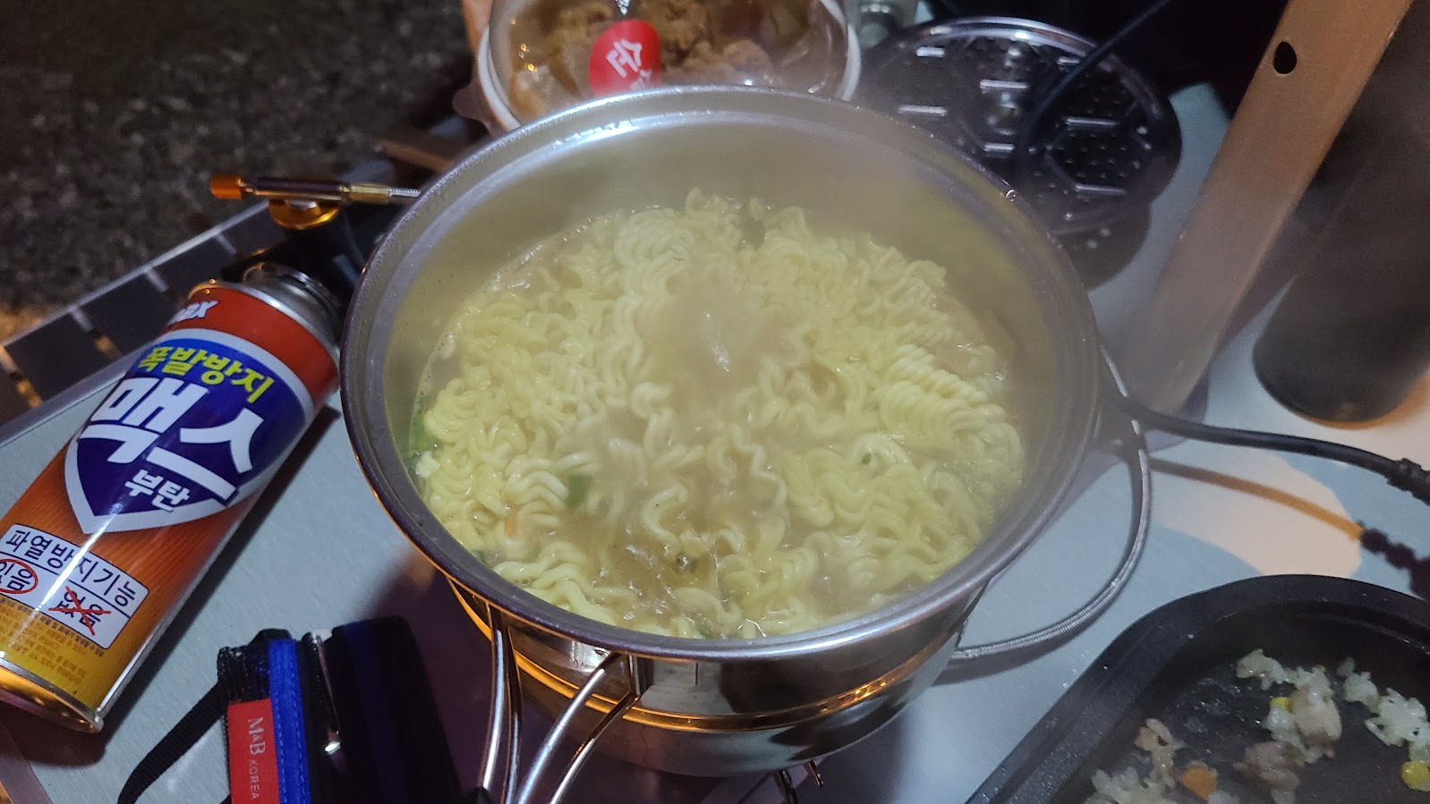 강염버너를 동원하여 충분한 화력으로 확 끓여봅니다. 일단 국물 색상이 스낵면을 보는 듯한 흰색(사실 누런색이지만 빨간것만 아니면 다 흰 국물이라 하니)입니다. 여기에 건조 어묵 몇 조각과 파조각, 당근 등이 들어갑니다. 사실 건더기를 기대하고 드시면 영 아닐 것입니다. 저도 그건 기대하지 않았으니... 맛을 함 보죠.
